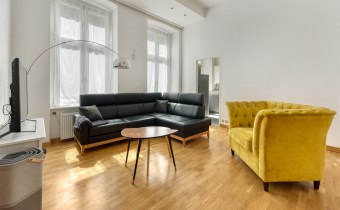 The apartment is fully furnished and equipped, with all municipal utilities. Its location in the rear annex ensures peace and quiet (the windows offer a nice view of the green Rubinstein Passage), while allowing you to enjoy all the advantages of living in the very center of the city.