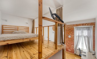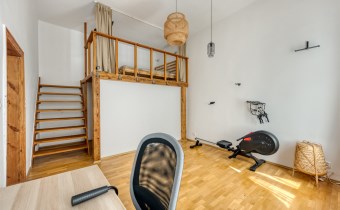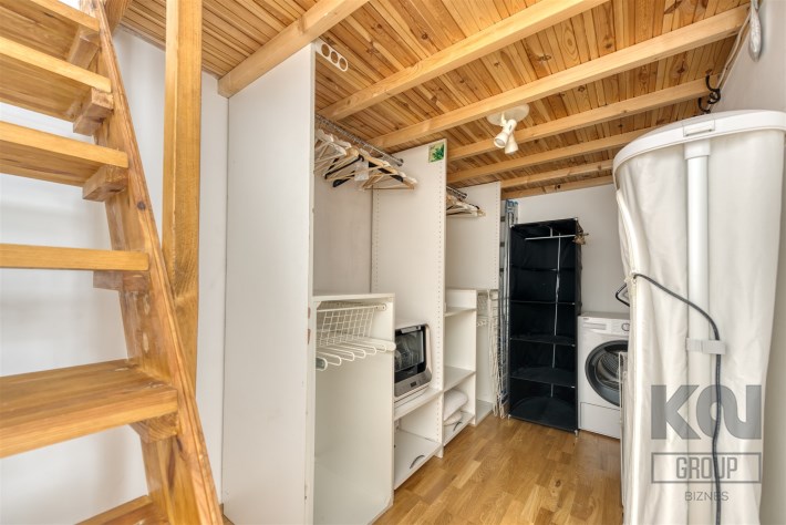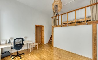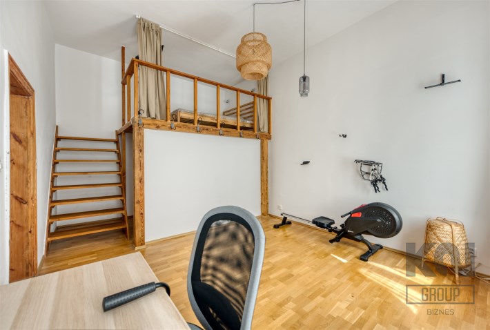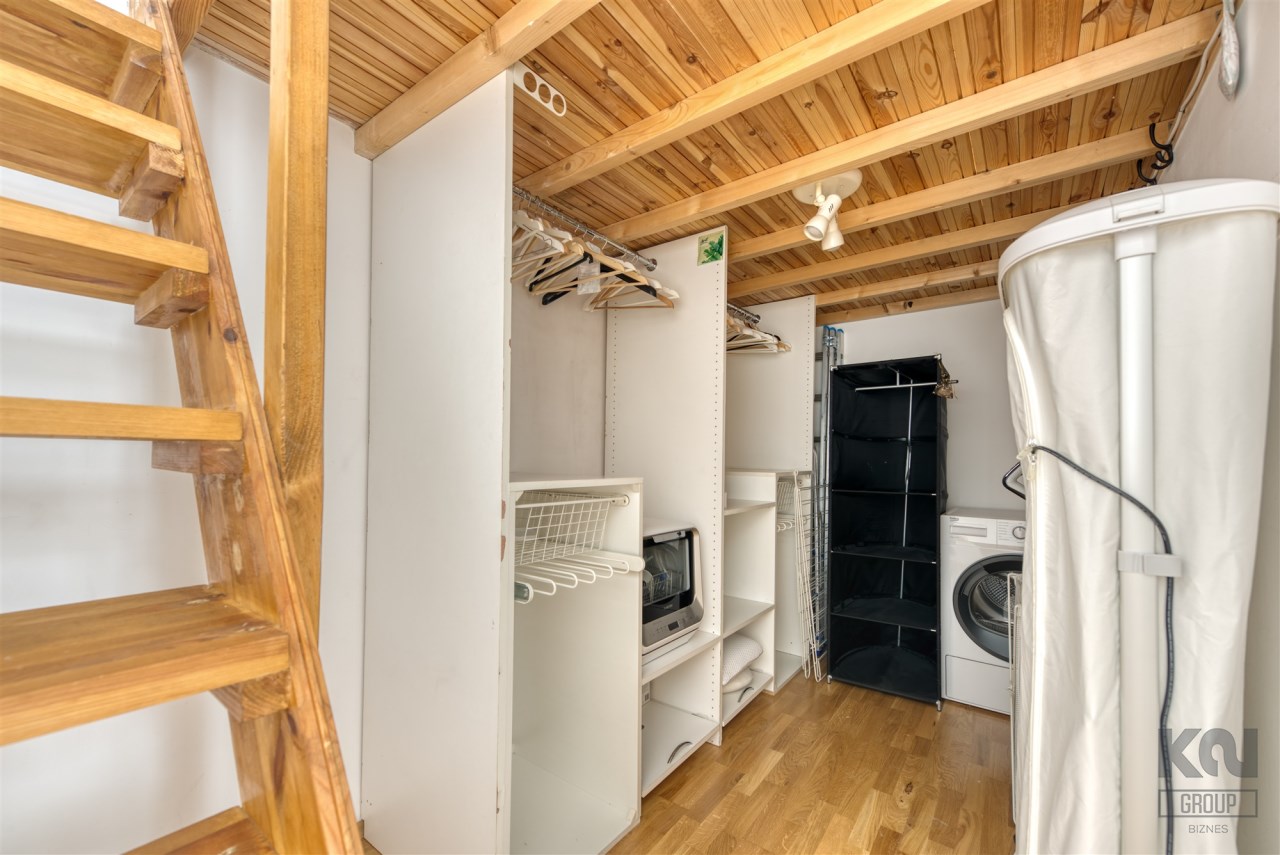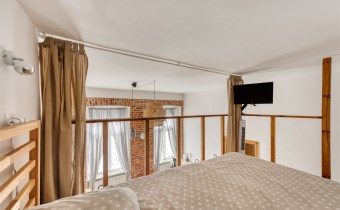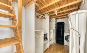 - a room with a work area and a mezzanine serving as a bedroom, with a very spacious wardrobe equipped with a dryer underneath;