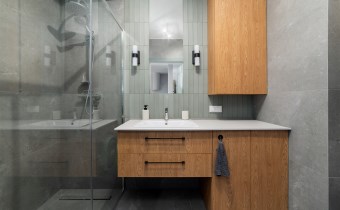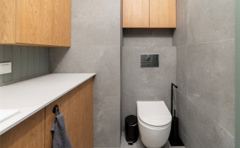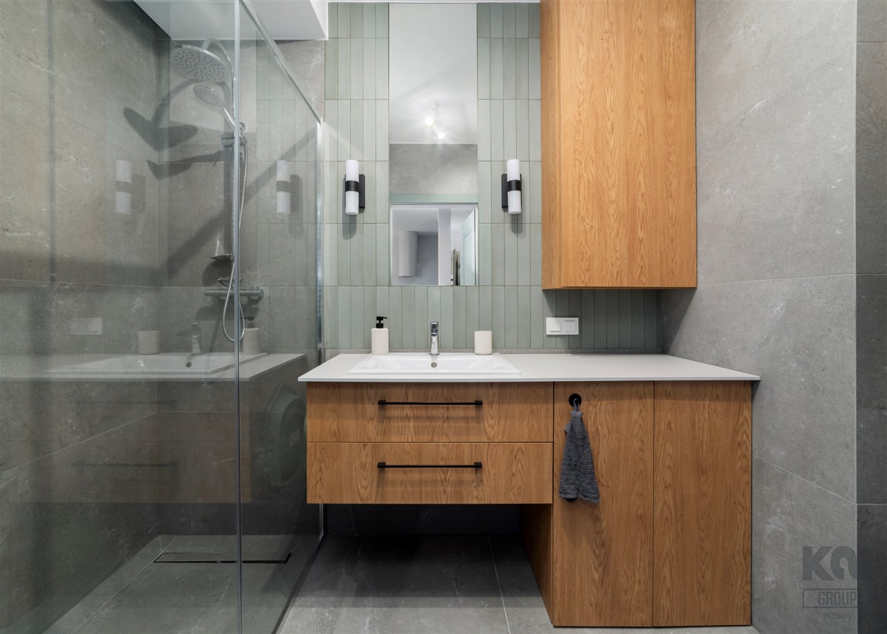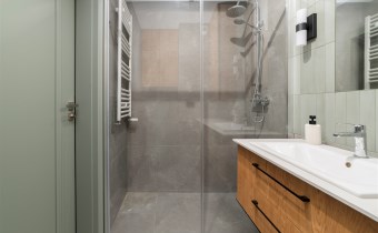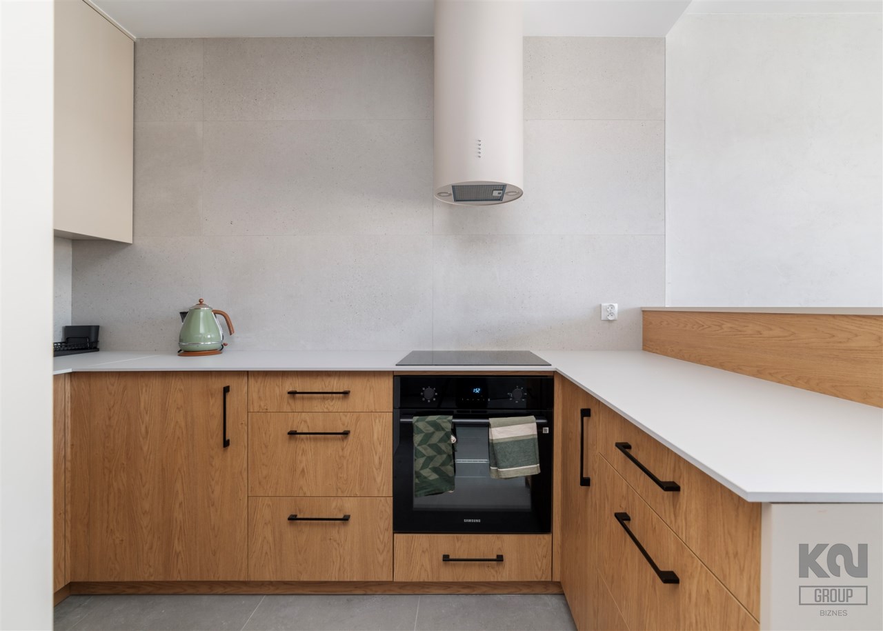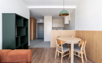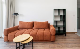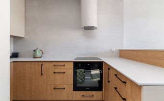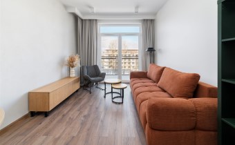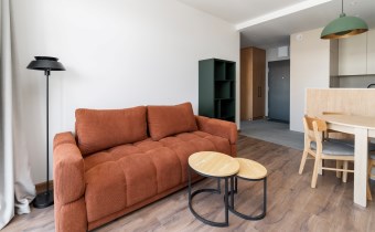 The apartment’s usable area includes: - an elegant living room with access to a balcony; - a modern kitchenette equipped with an induction hob, hood, oven, refrigerator, and dishwasher; - a bedroom with a comfortable bed, built-in wardrobe, and space for a dressing table or work area; - a spacious bathroom equipped with a shower and a washing machine; - a hall with a built-in wardrobe.