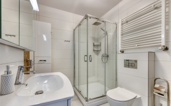 - bathroom with toilet equipped with a large shower cubicle and a washing machine;