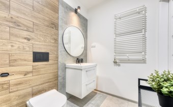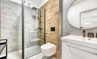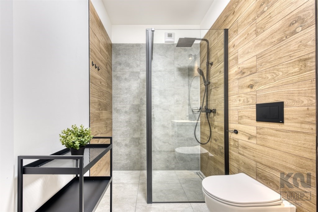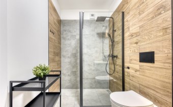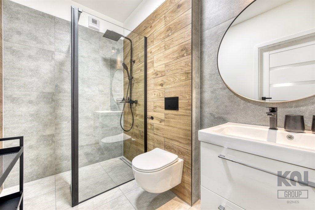 - a modern bathroom with a toilet equipped with a shower cabin;