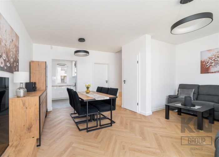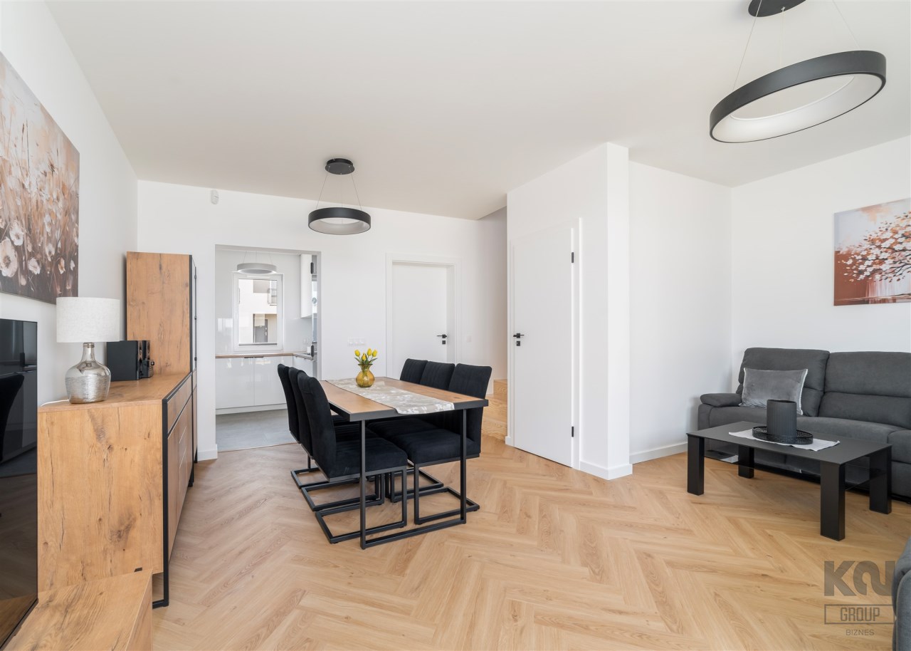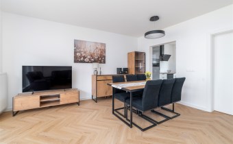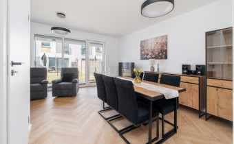 - przestronny salon z wygodnym kompletem wypoczynkowym, stolikiem kawowym, szafką RTV, telewizorem LED i częścią jadalnianą wyposażoną w stół z 6 krzesłami, komodę i witrynę;