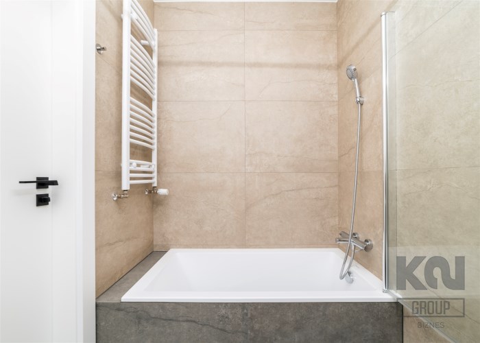 - łazienka z WC wyposażona w wannę z funkcją prysznica i umywalkę.