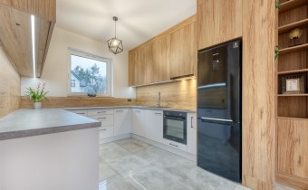 - aneks kuchenny umeblowany i wyposażony w zmywarkę, płytę indukcyjną, piekarnik, okap i lodówko-zamrażarkę;