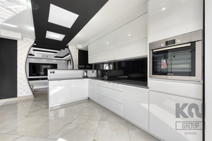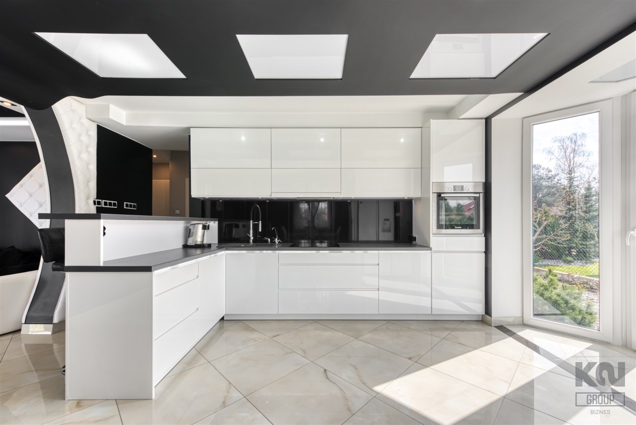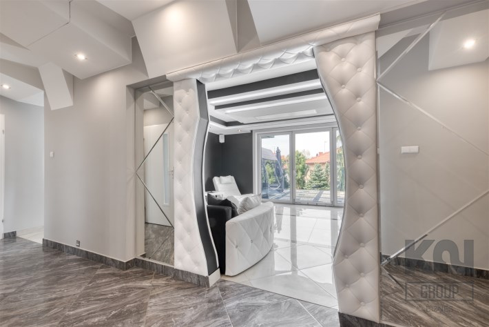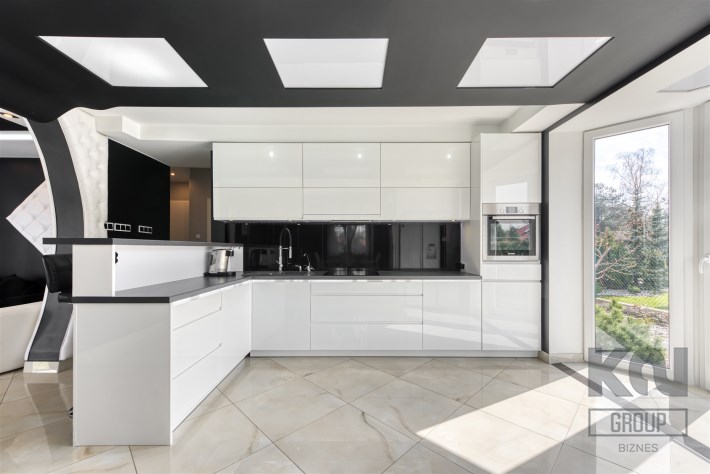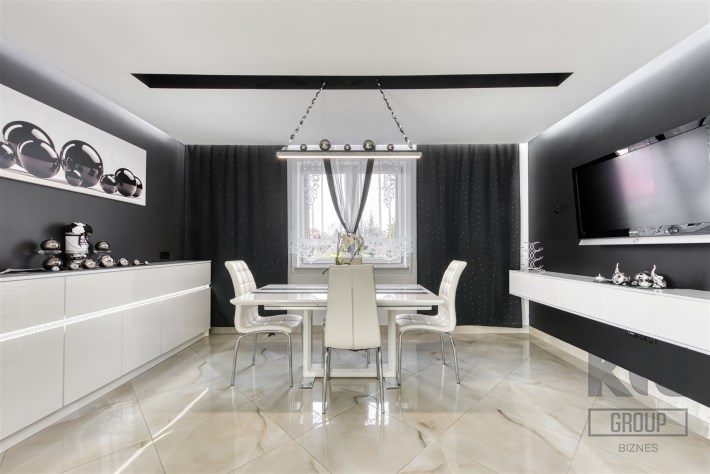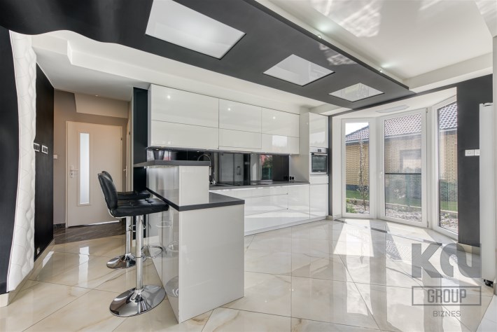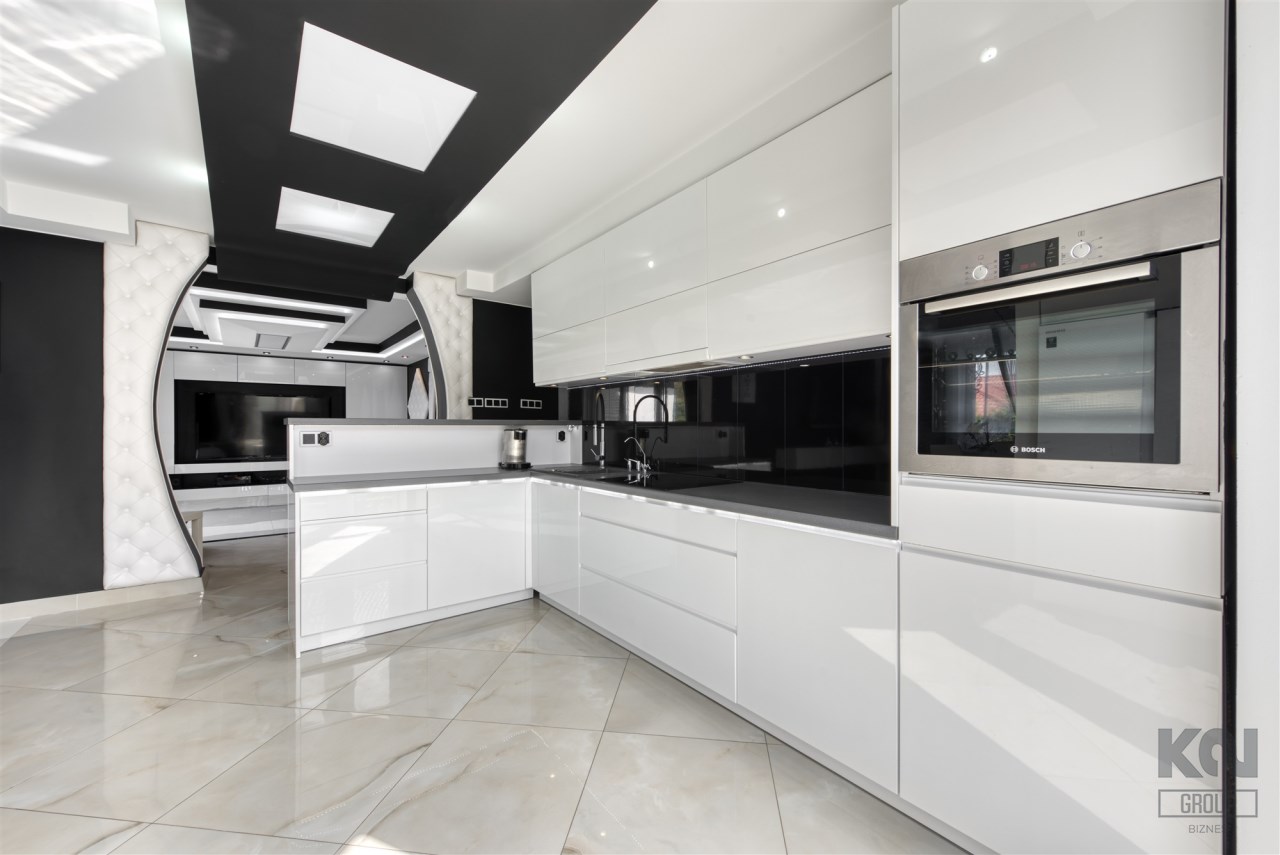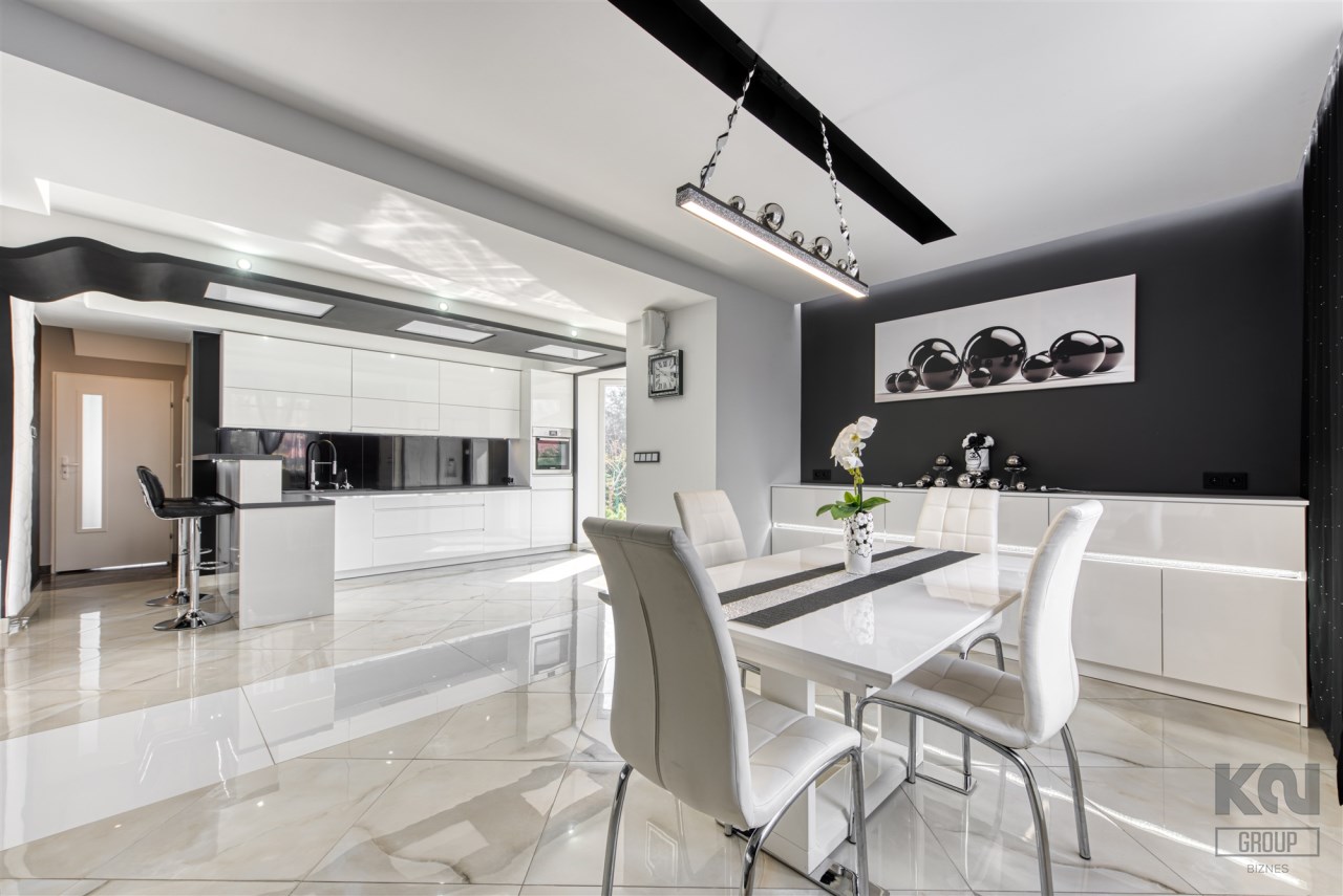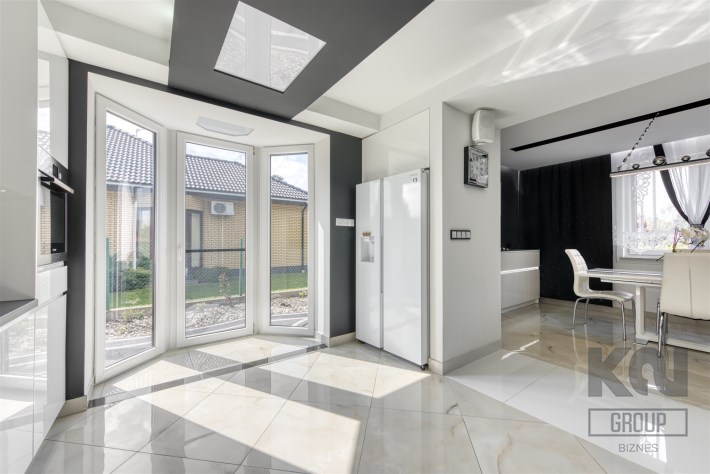 Dom jest kompletnie umeblowany i wyposażony, do wprowadzenia od zaraz. W skład wyposażenia wchodzą m.in. luksusowy komplet wypoczynkowy, telewizor LED 90", komplet kina domowego z dodatkowym rozprowadzeniem głośników w kuchni i na tarasie, w pełni zabudowana kuchnia wyposażona w najwyższej klasy sprzęty (płyta ceramiczna, piekarnik, zmywarka, lodówko-zamrażarka side-by-side, ekspres ciśnieniowy, toster), stół z krzesłami, komplet mebli ogrodowych etc.