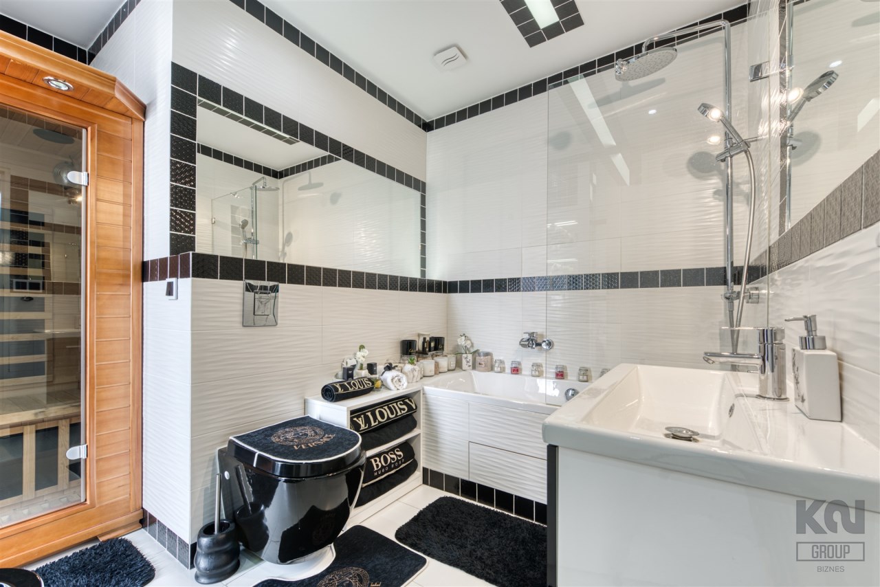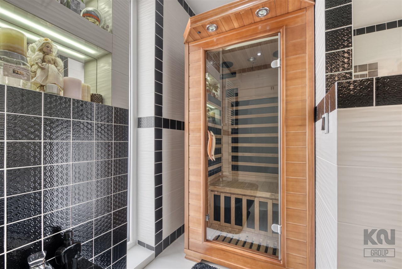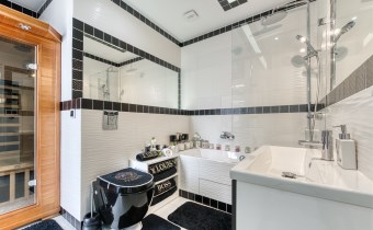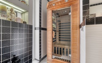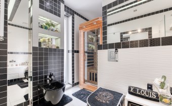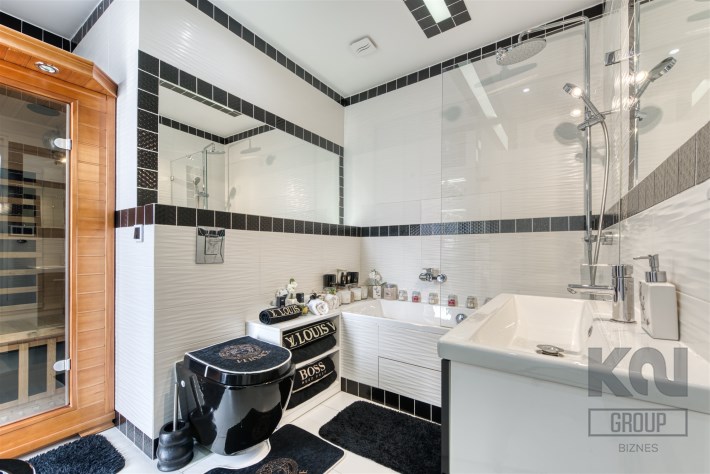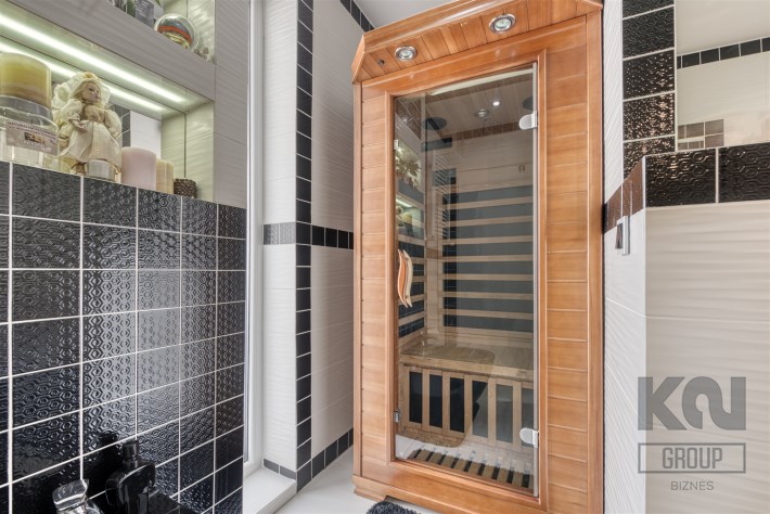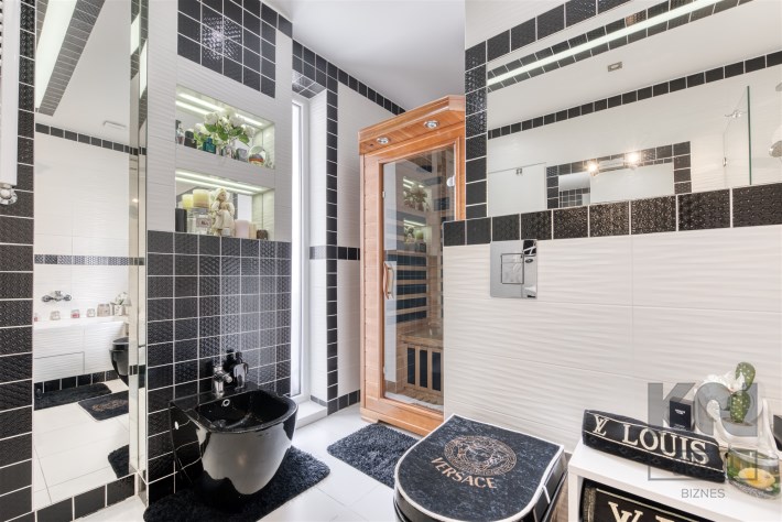 - główną sypialnię z łazienką en-suite wyposażoną w wannę z funkcją prysznica, umywalkę, bidet, WC i saunę;