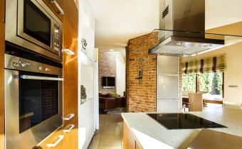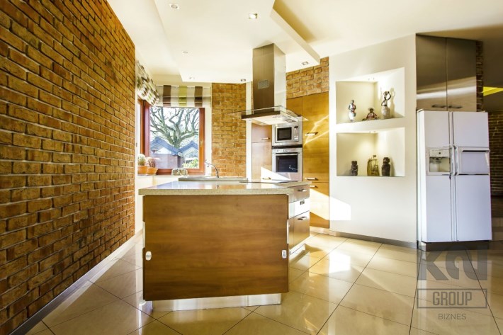 Na parterze - dającą poczucie swobody otwartą przestrzeń: wygodny, przestronny, słoneczny salon z kominkiem i wyjściem na taras; umeblowaną i wyposażoną w wysokiej klasy sprzęty kuchnię z wyspą; sypialnię; łazienkę z WC (wyposażoną w kabinę prysznicową); duży hall i wiatrołap z zabudowanymi szafami oraz garaż na dwa samochody z pomieszczeniem technicznym.