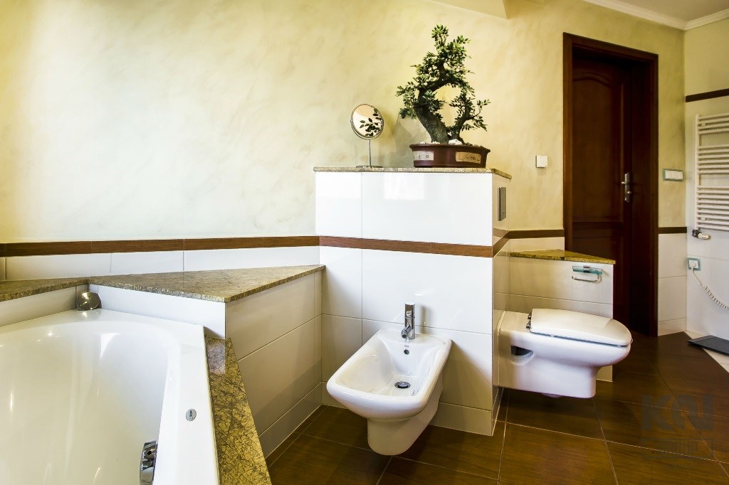 Na piętrze - dwie ustawne sypialnie z garderobami oraz łazienkę z WC i pralnią (wyposażoną w wannę, kabinę prysznicową oraz bidet).