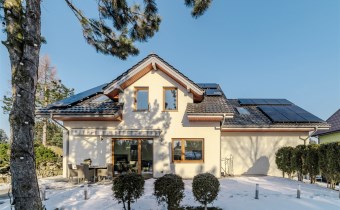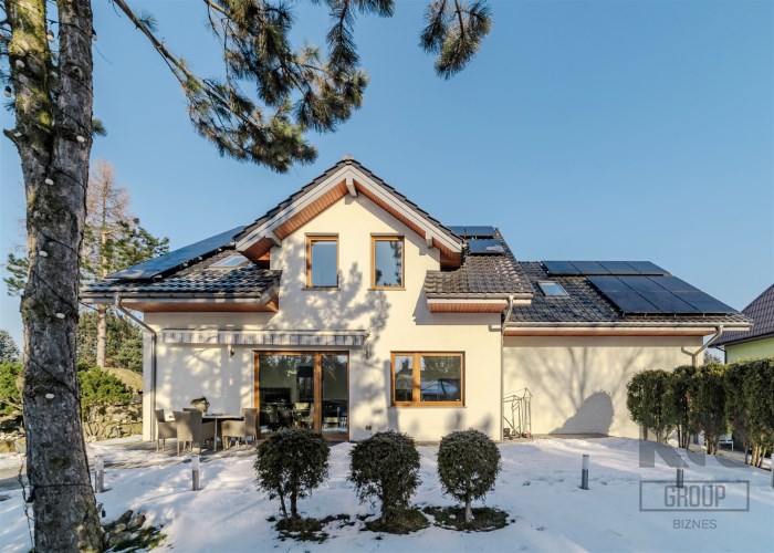 Dom ogrzewany jest powietrzną pompą ciepła, zasilaną instalacją fotowoltaiczną.
