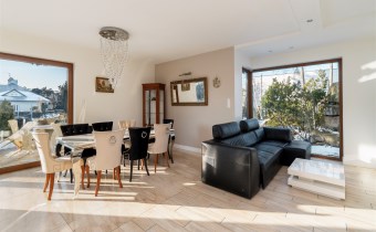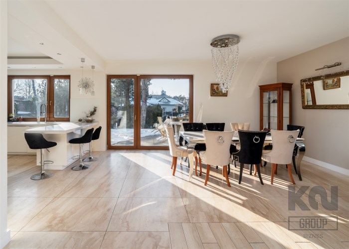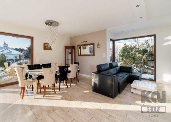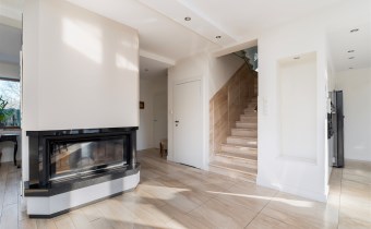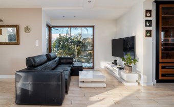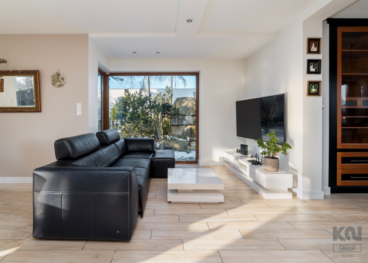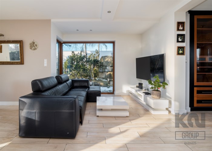 - Przestronny, jasny salon z dużymi przeszkleniami od strony południowej, które zapewniają znakomite doświetlenie przez cały dzień i otwierają widok na zielony ogród oraz efektowną, kamienną aranżację przestrzeni zewnętrznej.