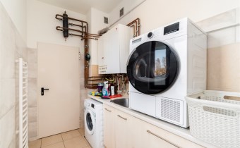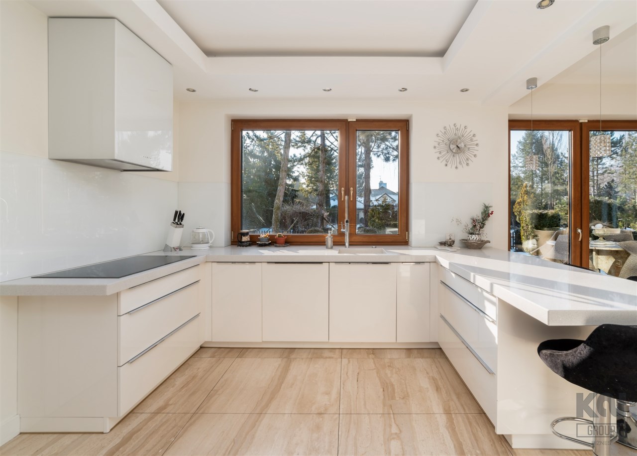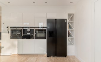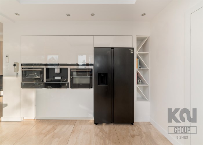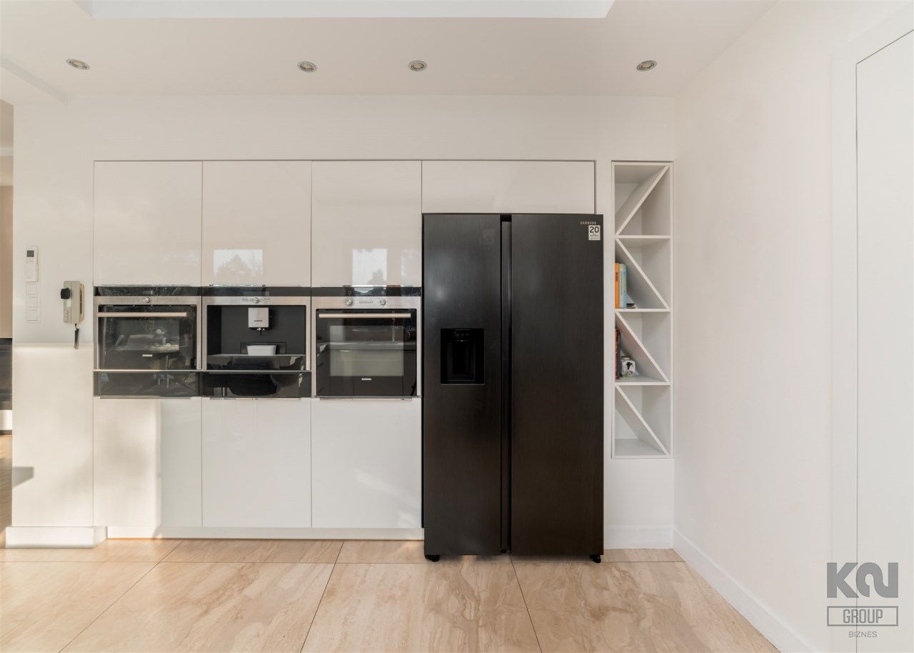 Kuchnia jest w pełni wyposażona w wysokiej klasy sprzęt Siemens: piekarnik, mikrofalę, ekspres do kawy w zabudowie oraz płytę indukcyjną, dużą lodówko-zamrażarkę side-by-side z kostkarką. Zabudowa kuchenna wykonana jest z lakierowanych, gładkich frontów, które podkreślają minimalistyczny, elegancki charakter wnętrza.
