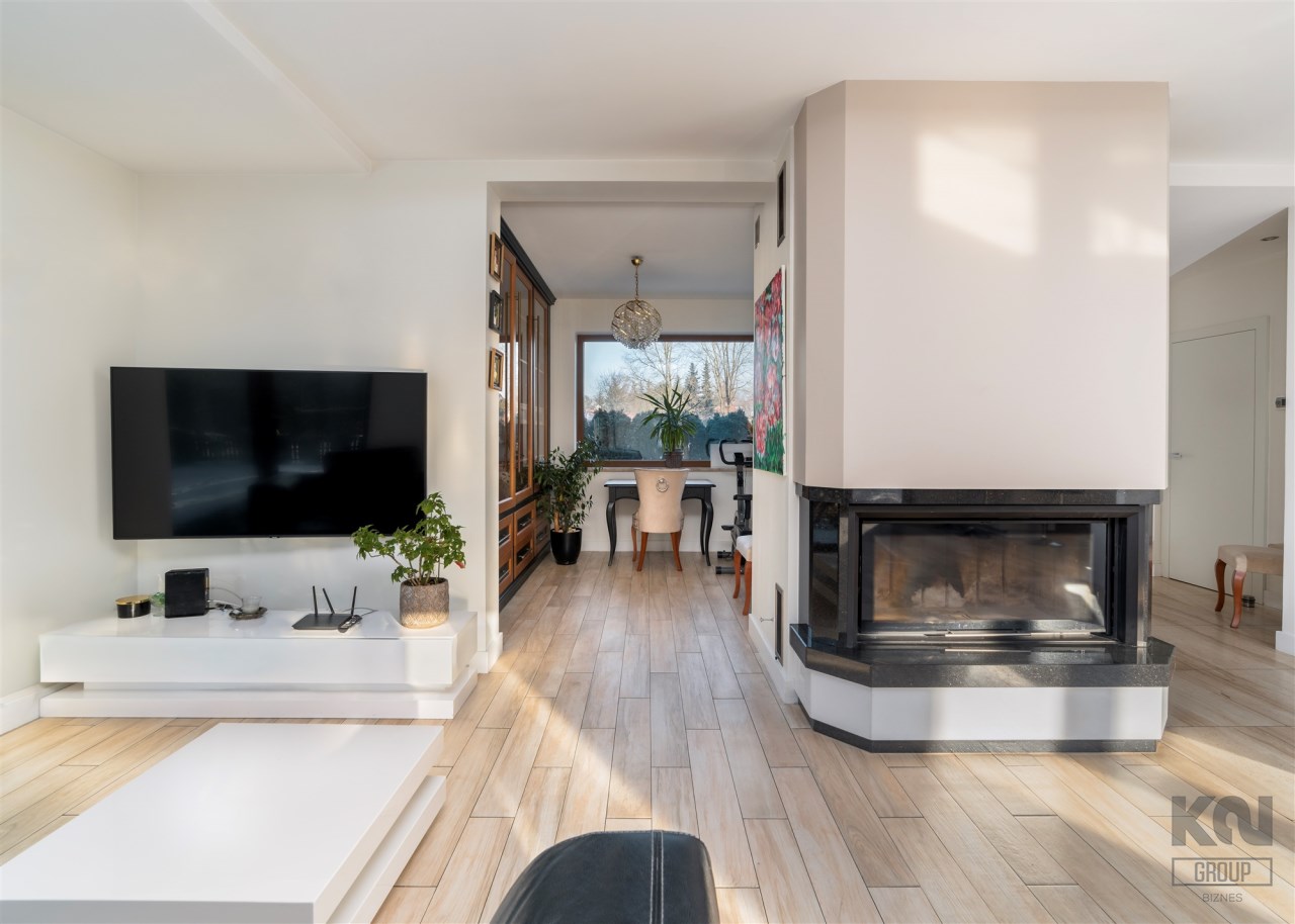 - W części wypoczynkowej znajduje się sofa oraz telewizor, a całość dopełnia duży kominek, który subtelnie oddziela przestrzeń salonu od gabinetu oraz strefy wejściowej.