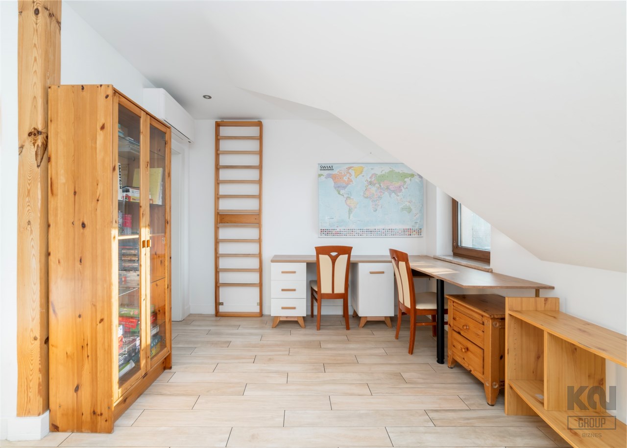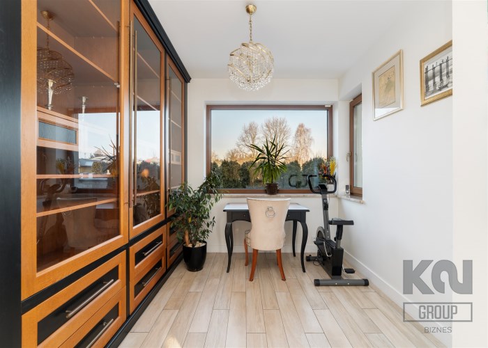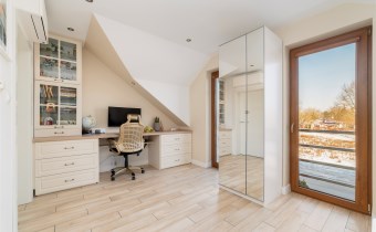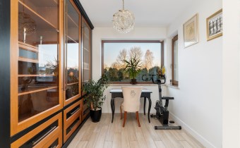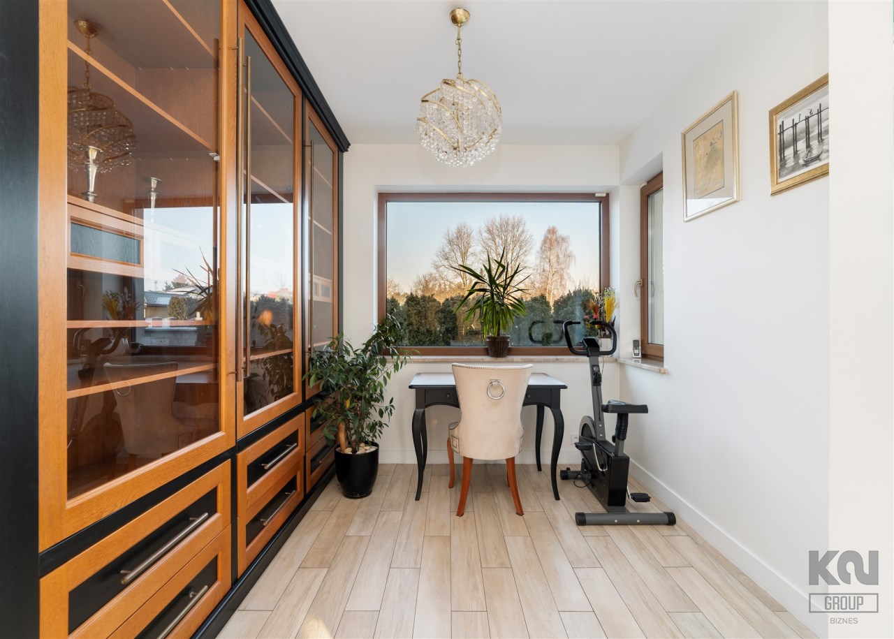 - Do salonu przylega elegancki gabinet - idealne miejsce do czytania - z okazałą zabudową biblioteczną z przeszklonymi frontami i licznymi półkami. Gabinet wyposażony w klasyczne biurko z krzesłami tworzy ergonomiczne i wygodne stanowisko pracy.