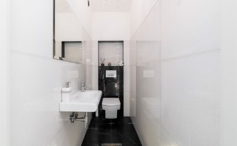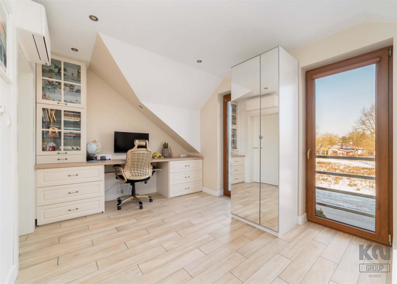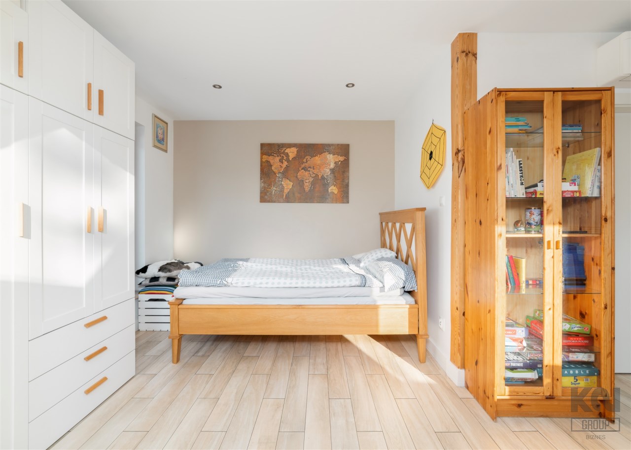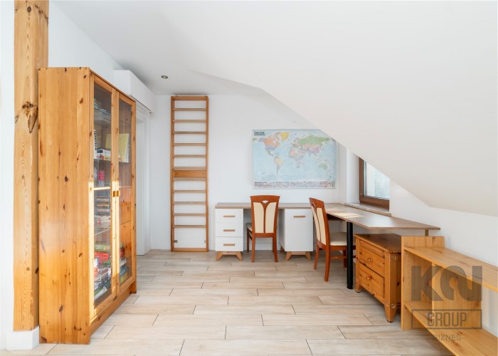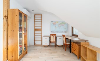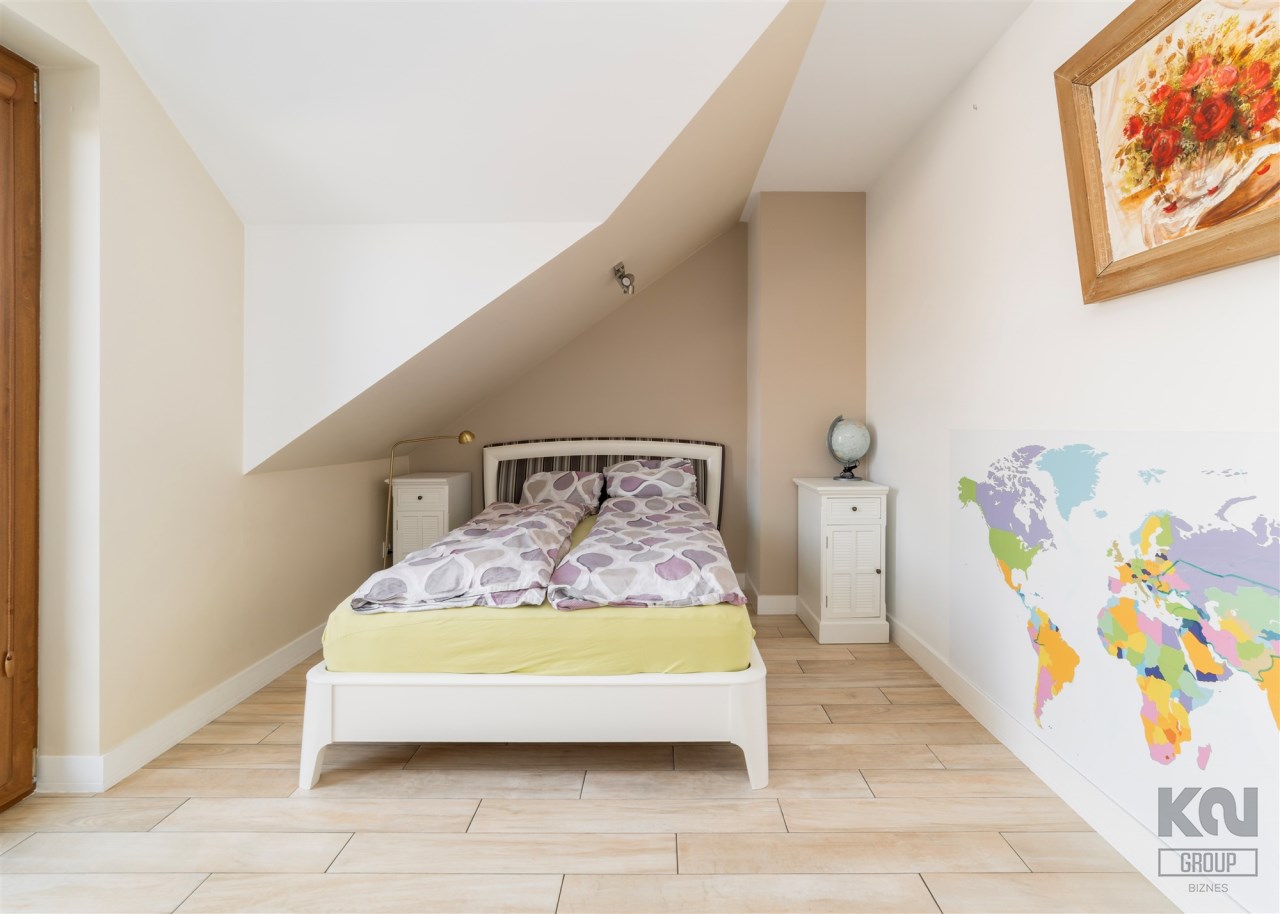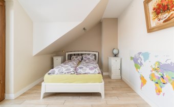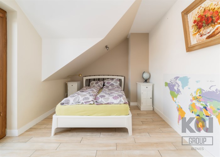 - Na piętrze znajdują się jeszcze dwa dodatkowe pokoje oraz elegancka łazienka z toaletą, wykończona w naturalnym kamieniu.