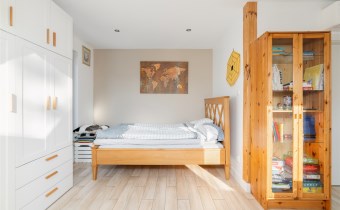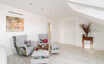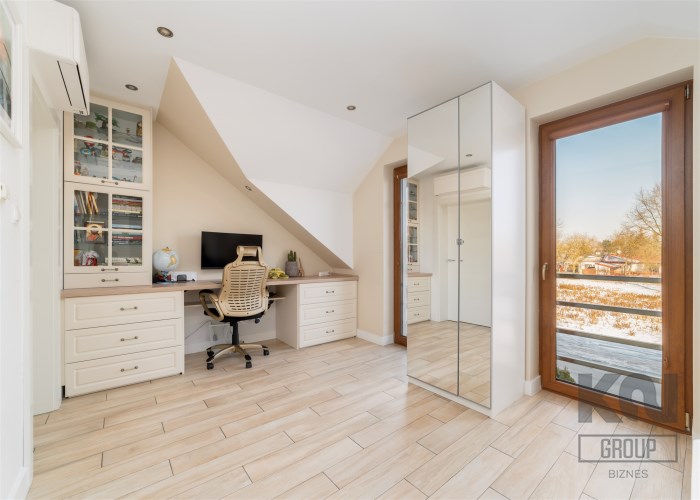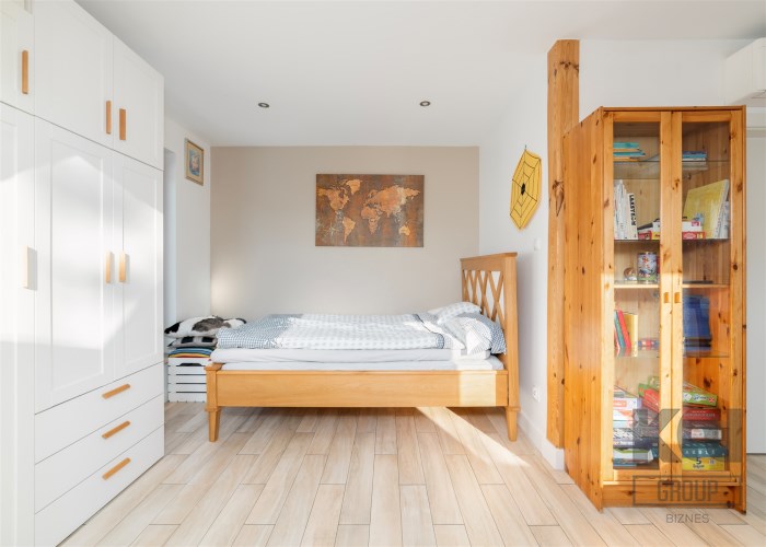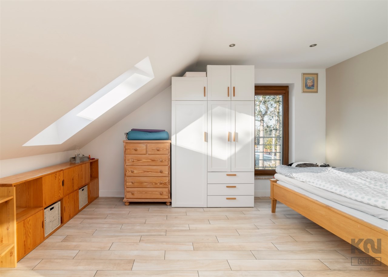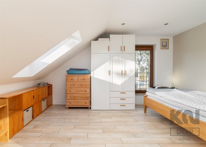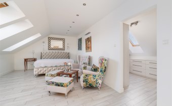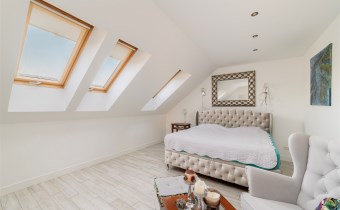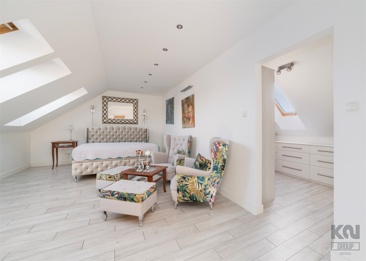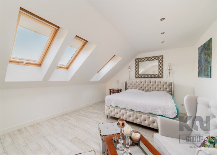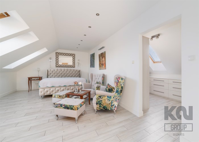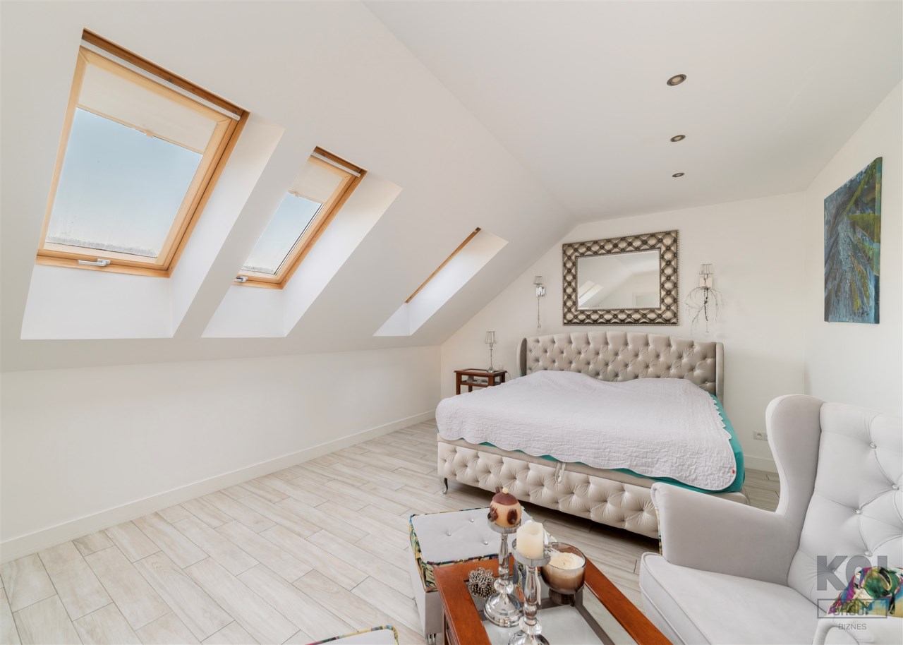- Sypialnia główna zajmuje najbardziej kameralną część piętra. Pomieszczenie jest doskonale doświetlone dzięki kilku dużym oknom połaciowym, co tworzy jasne, przyjemne wnętrze. W strefie wypoczynkowej znajduje się duże, tapicerowane łóżko oraz kącik z wygodnymi fotelami i stolikiem. Całość uzupełniają stylowe detale i subtelne oświetlenie punktowe.