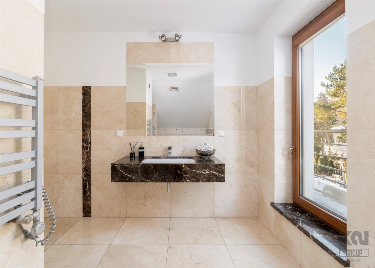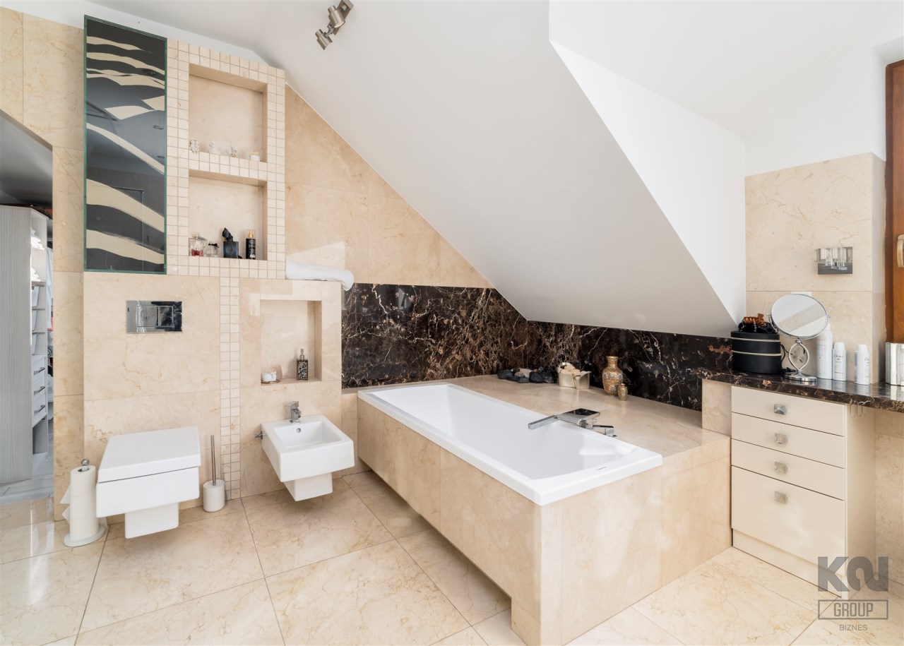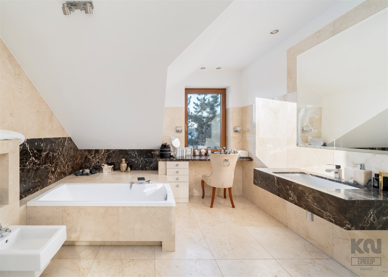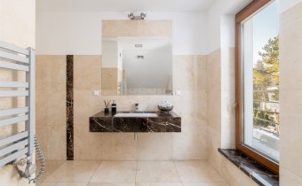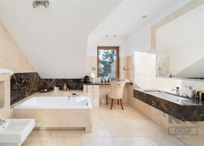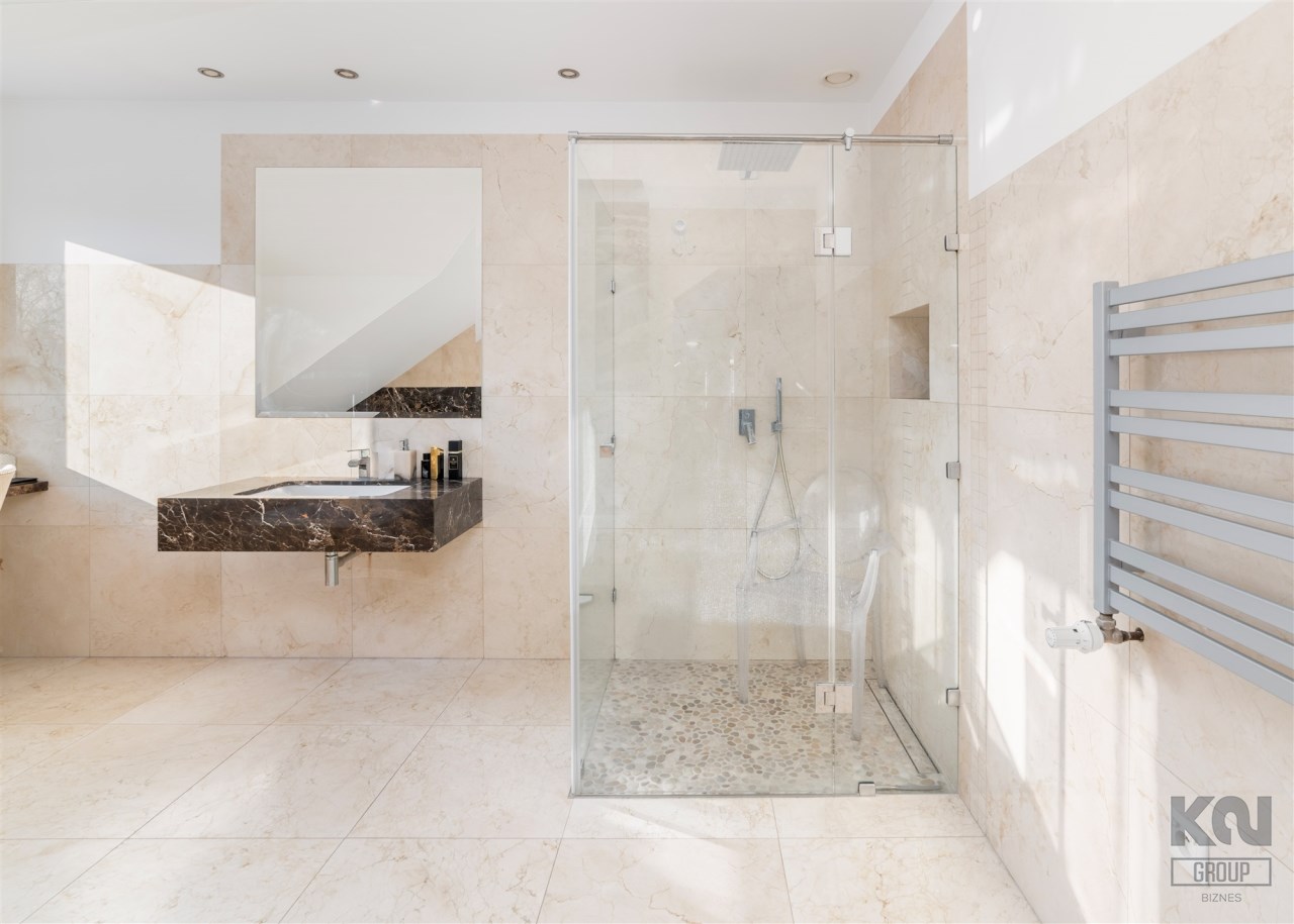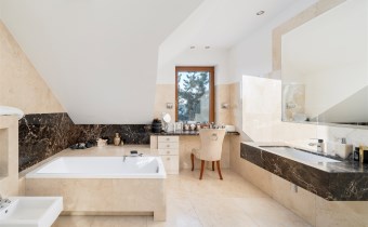 - Do sypialni master przylega elegancki, przestronny pokój kąpielowy wykończony w naturalnych kamieniach wyposażony w dużą, wygodną wannę wolnostojącą w zabudowie, osobną przestrzeń prysznicową, szeroką konsolę z umywalką, duże lustro, wydzieloną toaletkę przy oknie – idealna do pielęgnacji oraz pojemne półki i wnęki na kosmetyki.