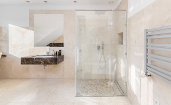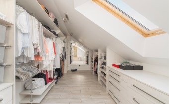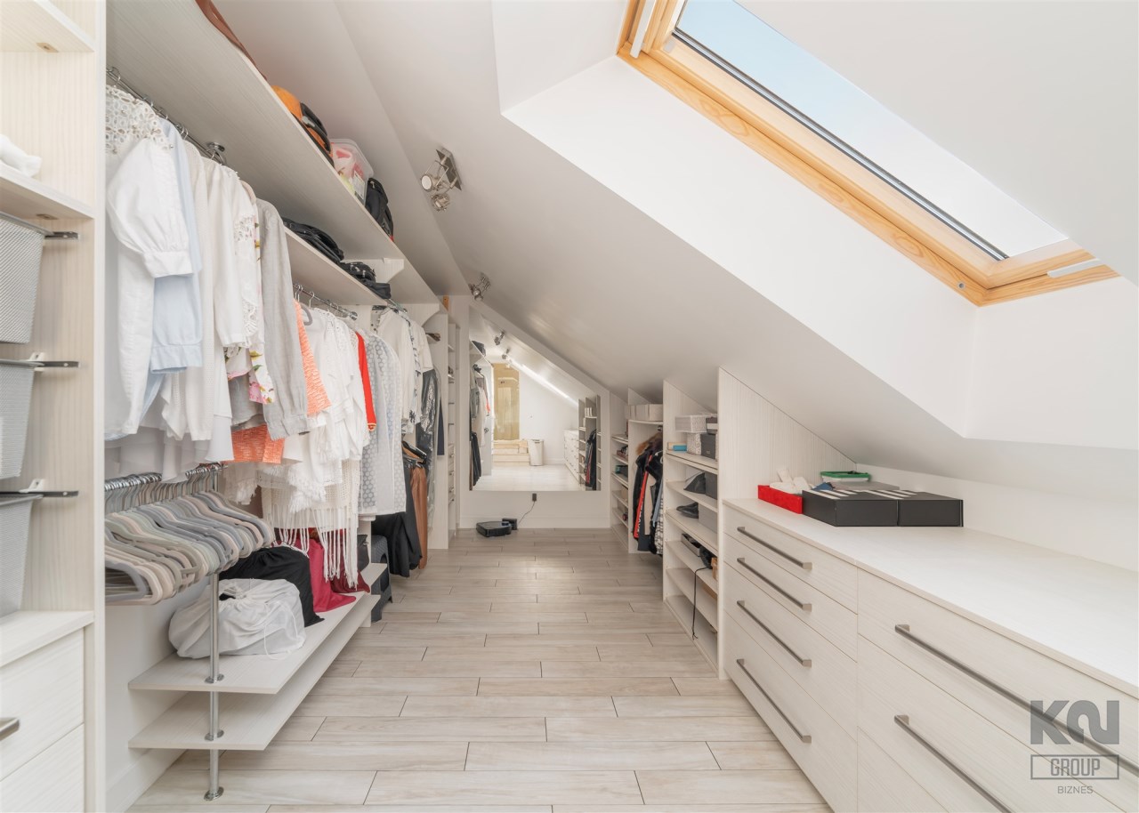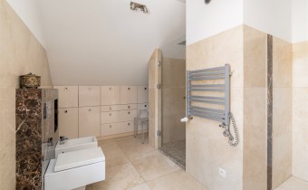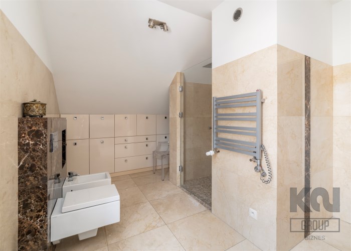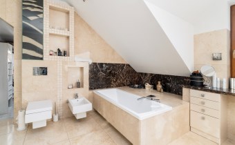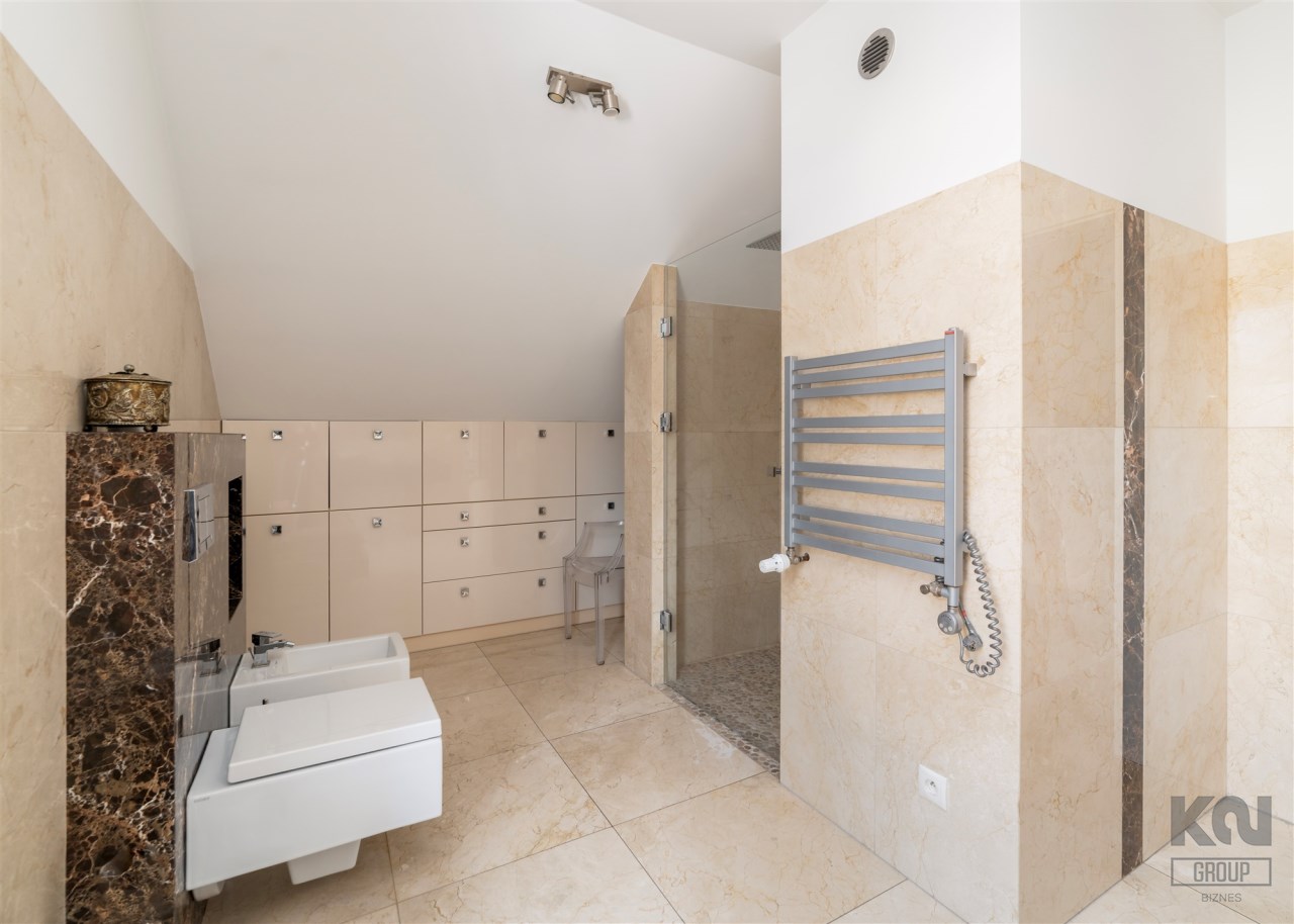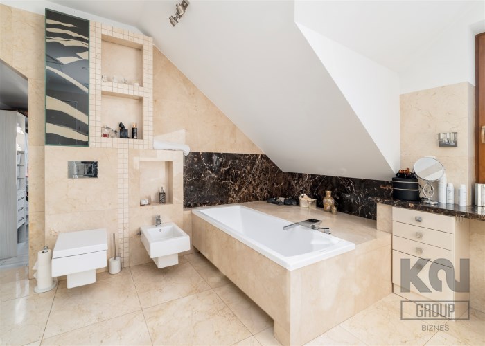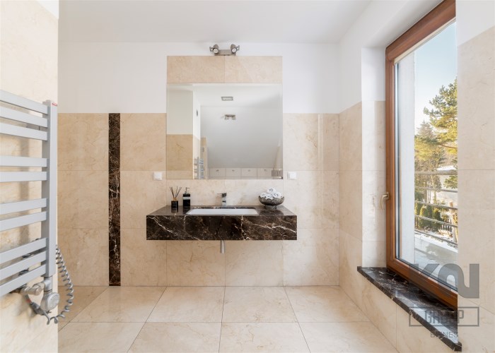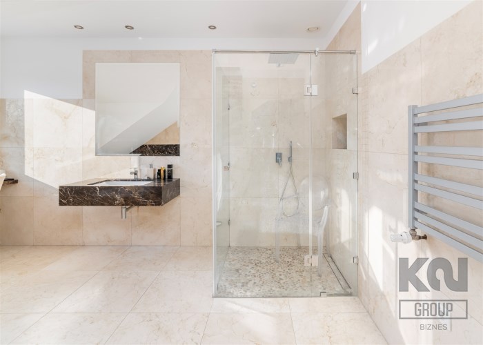- Do sypialni master przylega elegancki, przestronny pokój kąpielowy wykończony w naturalnych kamieniach wyposażony w dużą, wygodną wannę wolnostojącą w zabudowie, osobną przestrzeń prysznicową, szeroką konsolę z umywalką, duże lustro, wydzieloną toaletkę przy oknie – idealna do pielęgnacji oraz pojemne półki i wnęki na kosmetyki.
