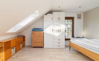 Piętro domu stanowi komfortową i prywatną część mieszkalną, zaprojektowaną tak, aby zapewnić domownikom maksymalny spokój, przestrzeń i funkcjonalność. Znajdują się tu strefy: sypialnia master z prywatnym pokojem kąpielowym i garderobą, dwa dodatkowe pokoje oraz przestronna łazienka z WC.
