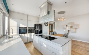 Aneks kuchenny - wysokiej klasy sprzęty: płyta indukcyjna Siemens, płyta teppanyaki Siemens, piekarnik Siemens, ekspres do kawy z szufladą grzewczą Siemens, zmywarka Siemens, lodówko-zamrażarka Bosch, okap wyspowy Miele;