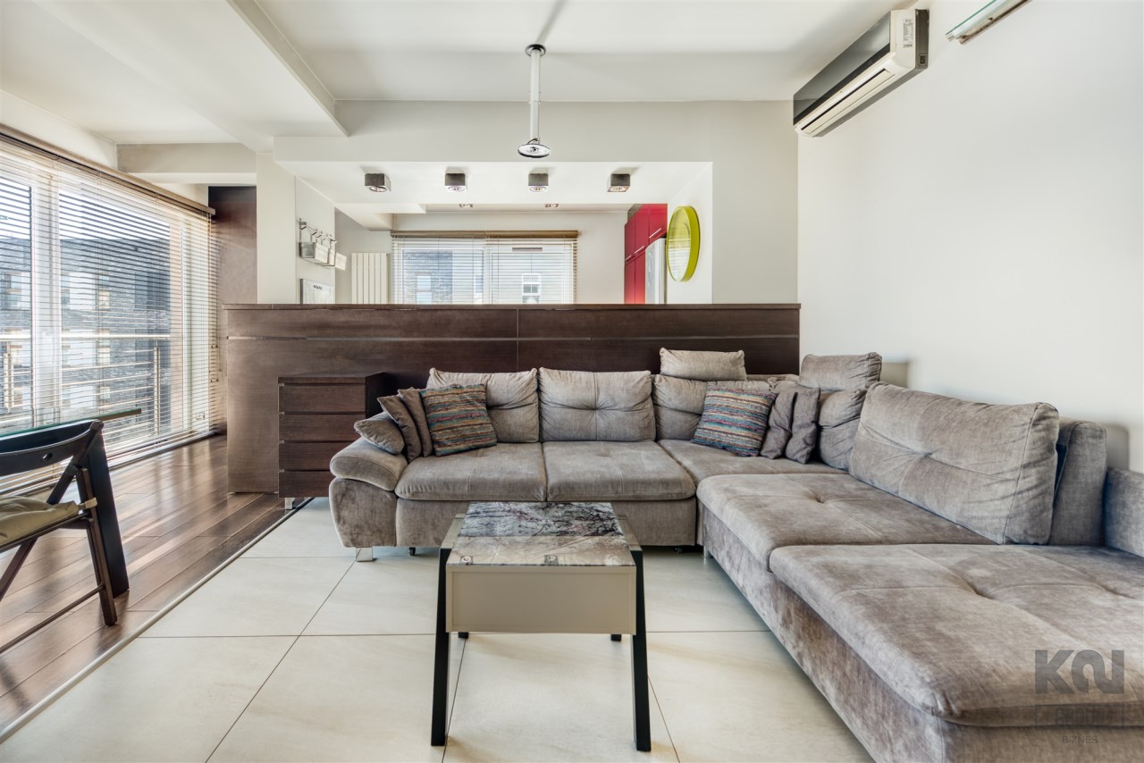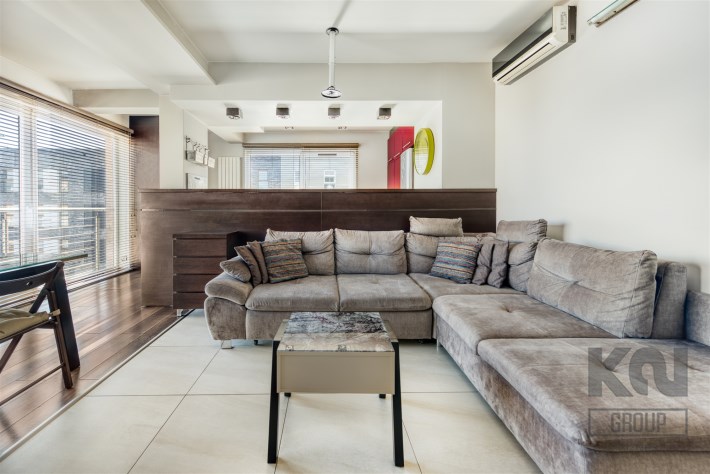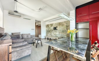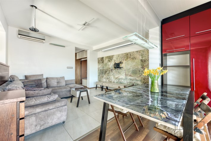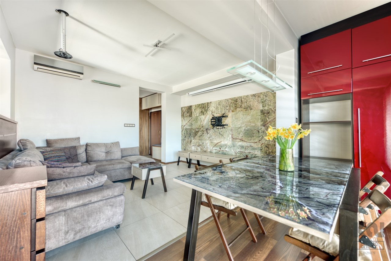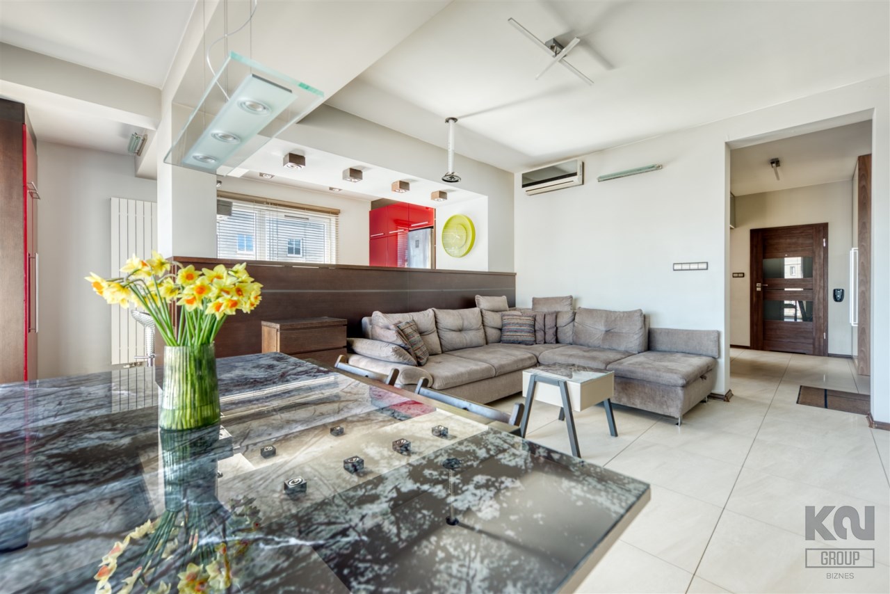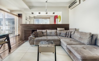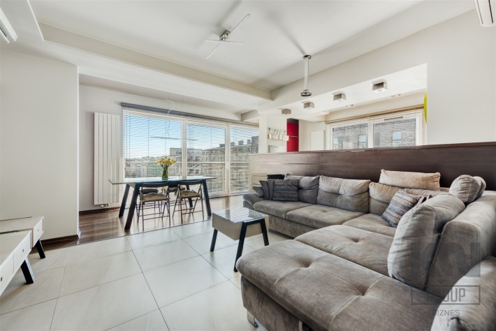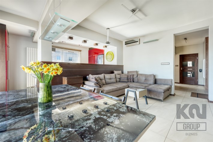 - Salon – przestronny, bardzo dobrze doświetlony, stanowiący centralną część mieszkania. Wnętrze utrzymane w spójnej stylistyce, z wyraźnie wydzieloną strefą relaksu (duża narożna sofa) oraz częścią jadalnianą z pełnowymiarowym stołem. Całość uzupełnia przemyślane oświetlenie sufitowe oraz klimatyzacja zapewniająca komfort w okresie letnim.