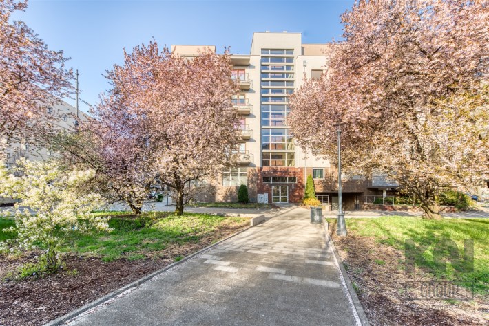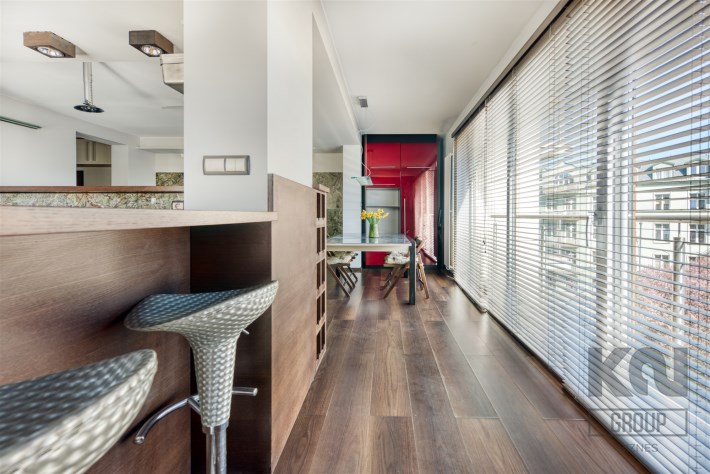 Mieszkanie położone na czwartej kondygnacji budynku. Dzięki dużym, panoramicznym przeszkleniom oferuje bardzo dobre doświetlenie światłem dziennym oraz atrakcyjny widok na skwer i zieleń. Widok z salonu zmienia się wraz z porami roku – latem wypełniony jest zielenią i kwitnącymi drzewami, zimą staje się bardziej otwarty, z widoczną perspektywą ulicy Legionów.