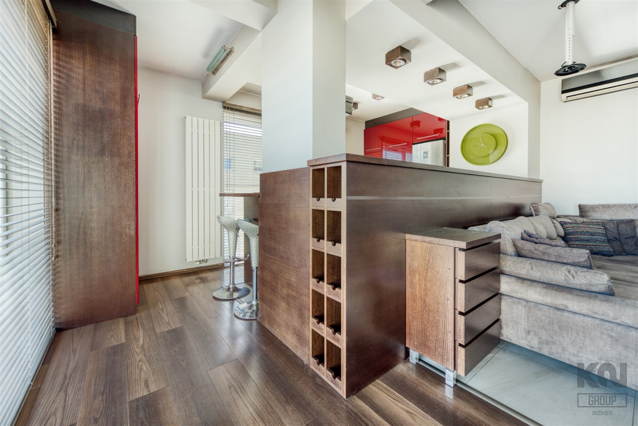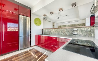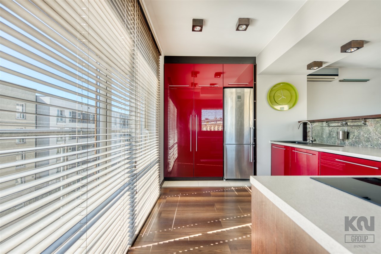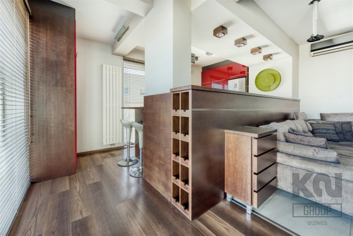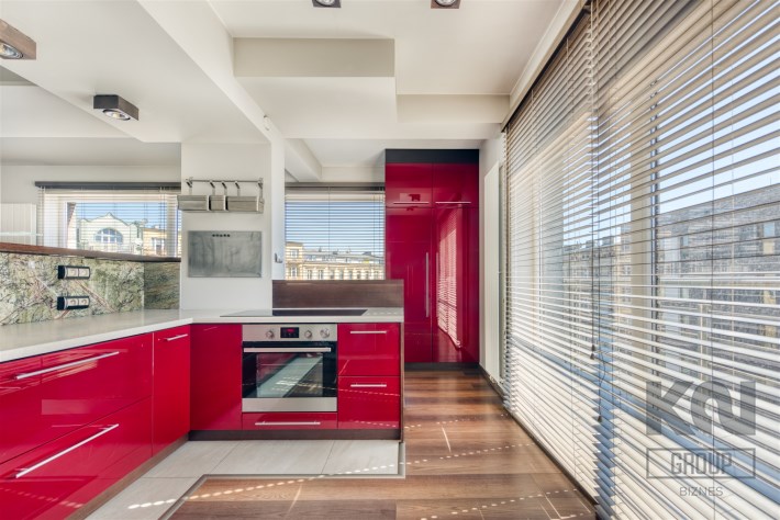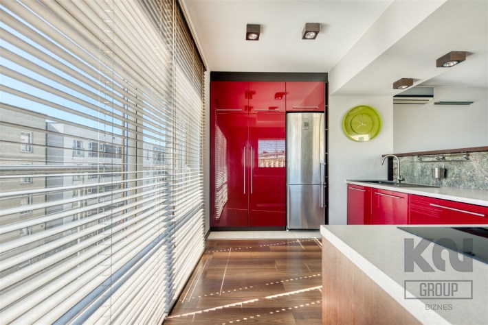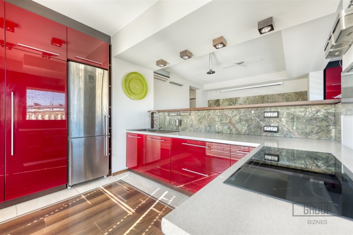 - Kuchnia – funkcjonalna, otwarta na salon, a jednocześnie czytelnie wydzielona zabudową oraz blatem barowym. Układ w kształcie litery „U” zapewnia bardzo dobrą ergonomię pracy oraz dużą ilość powierzchni roboczej. Kuchnia wyposażona jest w stałą zabudowę, oświetlenie punktowe oraz sprzęty AGD: płytę indukcyjną, piekarnik, zmywarkę oraz lodówko-zamrażarkę.