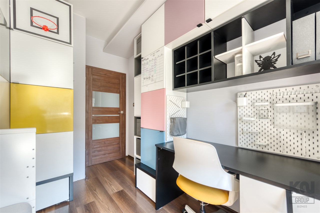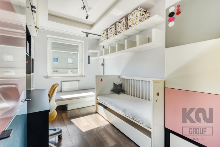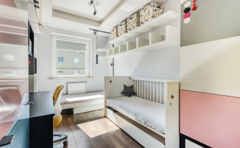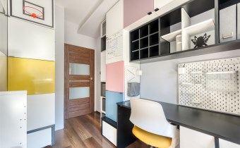 - Pokój – zaprojektowany jako funkcjonalna przestrzeń dla dziecka, z wyraźnym podziałem na strefę snu, nauki i przechowywania. Układ oraz zastosowana zabudowa umożliwiają łatwą zmianę funkcji pomieszczenia, np. na gabinet do pracy.