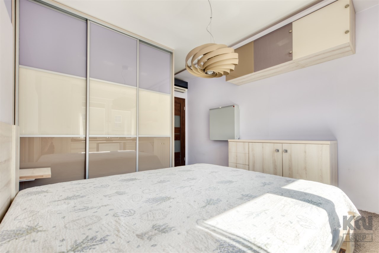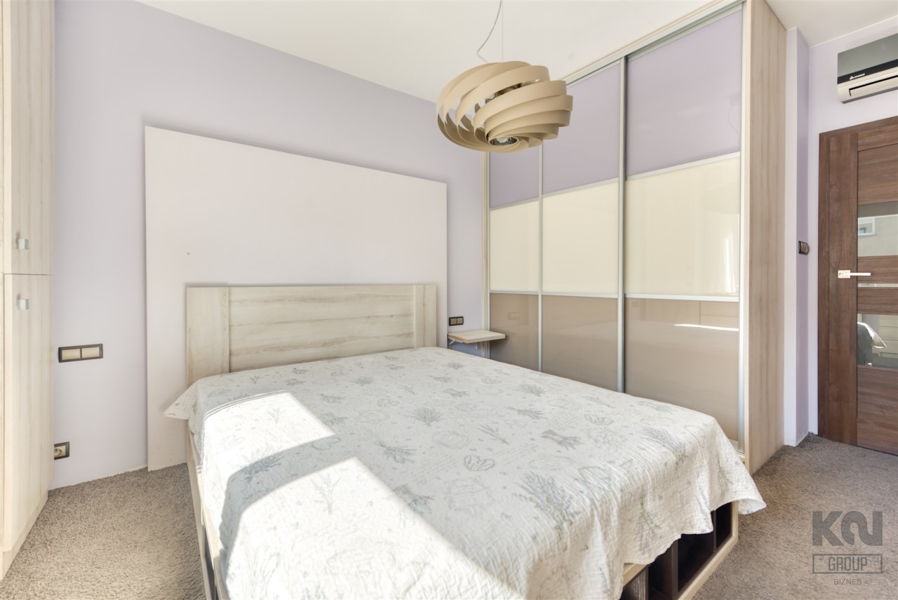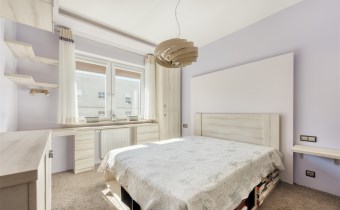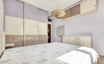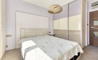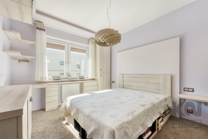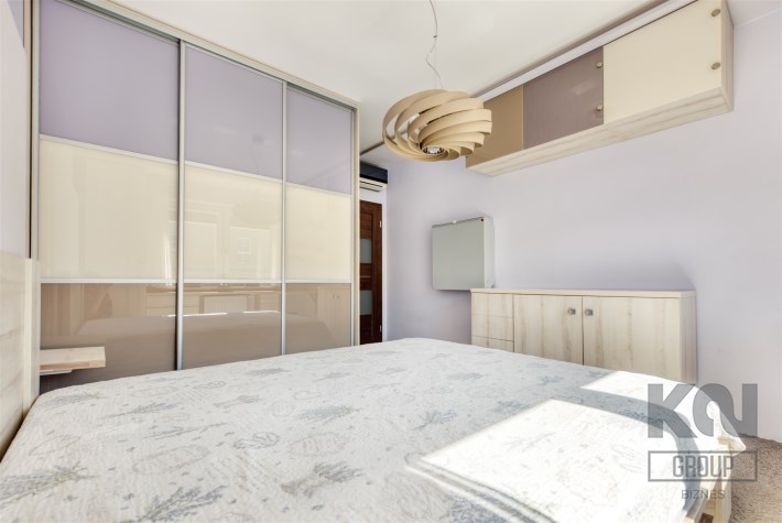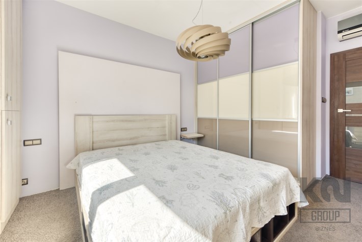 - Sypialnia – z zabudową meblową wykonaną na wymiar: pojemna szafa z przesuwnymi frontami oraz dodatkowe szafki i blat przy oknie. Wyposażona w łóżko małżeńskie.