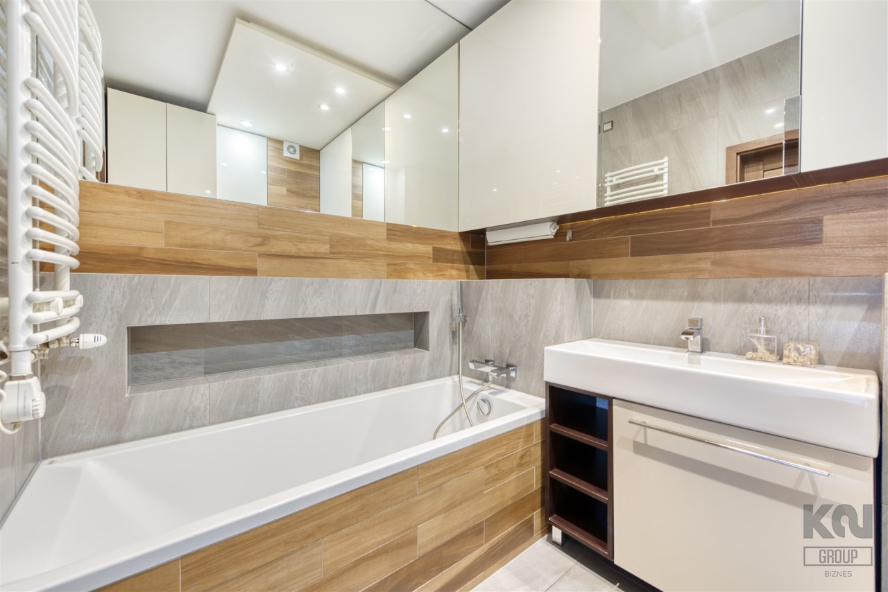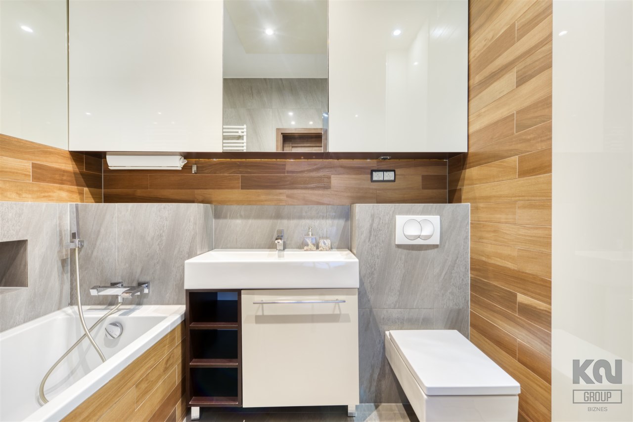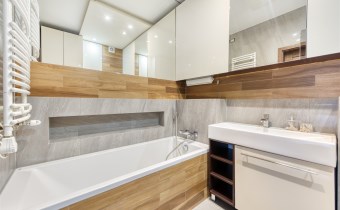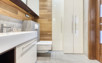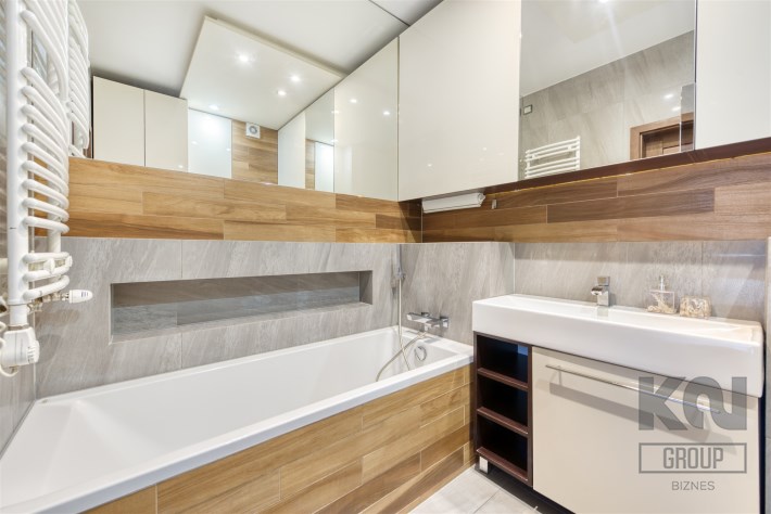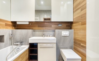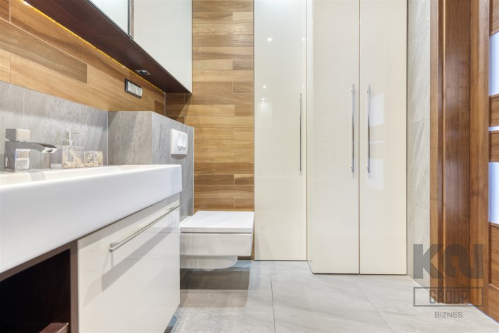 - Łazienka z WC – wyposażona w wannę oraz praktyczną wnękę na kosmetyki; szeroką umywalkę, lustro i sedes. Dodatkowym atutem jest zabudowa na wymiar, pozwalająca na estetyczne ukrycie funkcji gospodarczych.