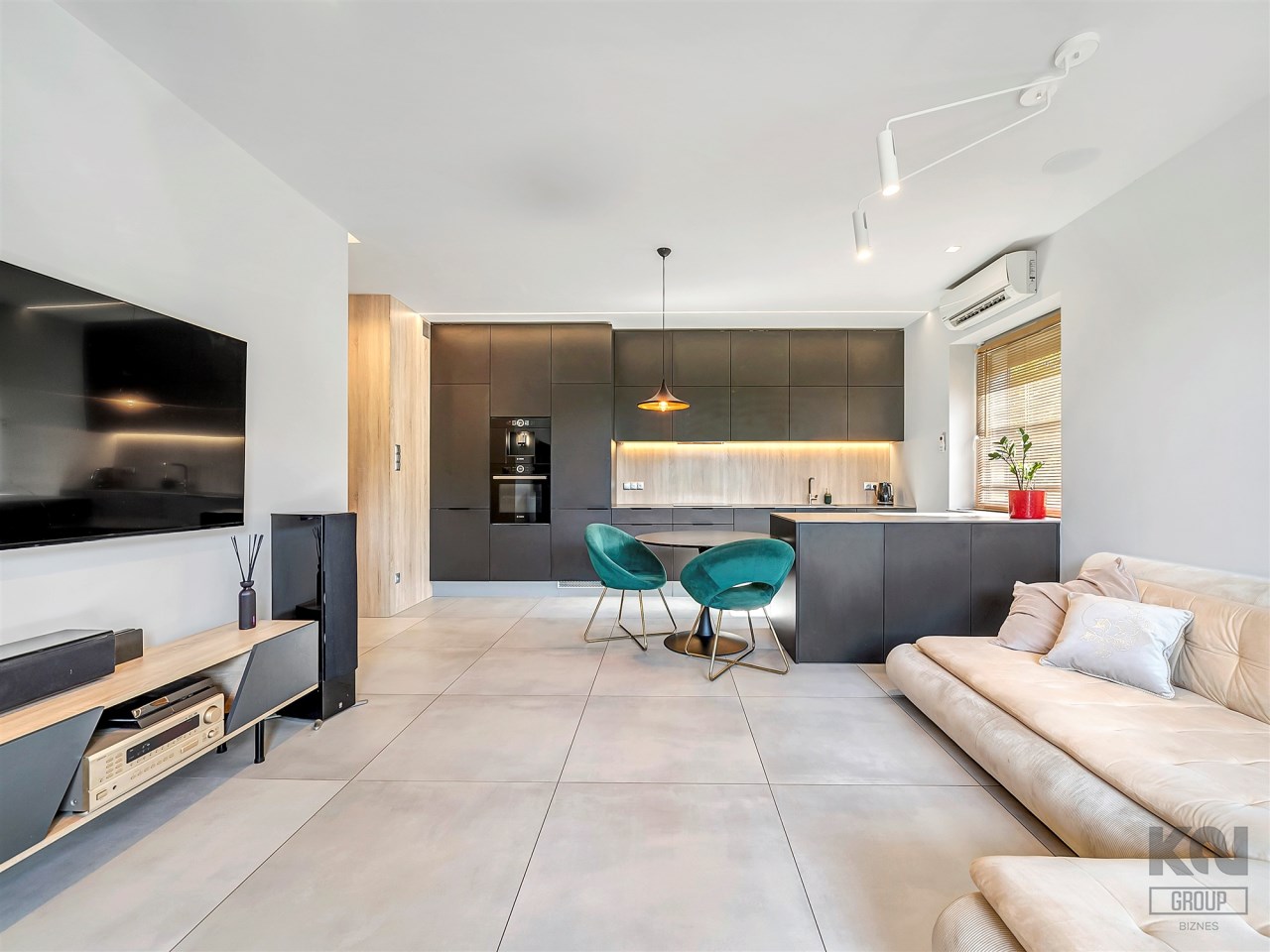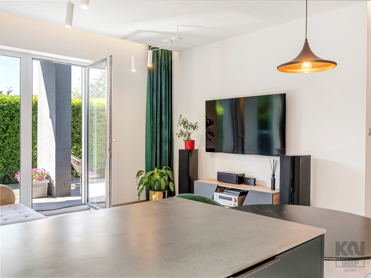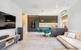 Część wypoczynkowa to neutralna kolorystyka ocieplona dodatkami – duża narożna sofa, telewizor na ścianie oraz instalacja głośników w suficie zapewniająca kinową jakość dźwięku. Dodatkowym atutem jest klimatyzacja Panasonic, gwarantująca komfort o każdej porze roku.