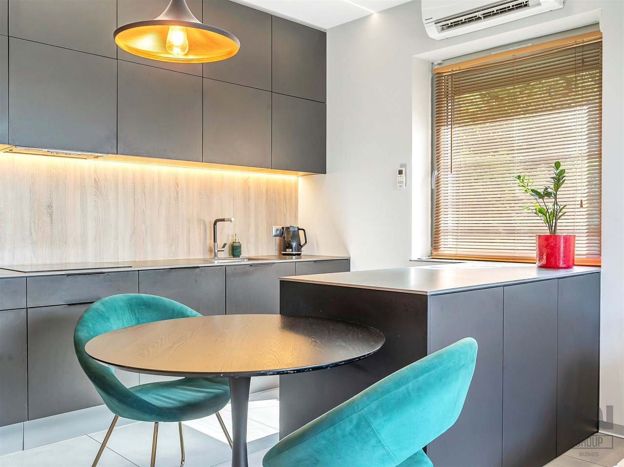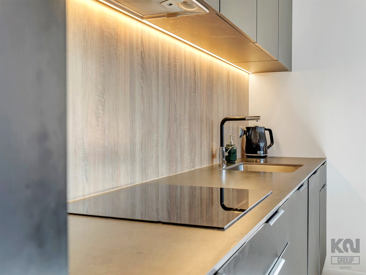 i ekspres Bosch (seria 6), płytę indukcyjną Beko, lodówkę Samsung, zmywarkę oraz blat roboczy ze spieku kwarcowego (12 mm). Wyspa pełni funkcję dodatkowej przestrzeni roboczej oraz wygodnego barku. Dyskretne podświetlenie LED podkreśla nowoczesny charakter wnętrza.