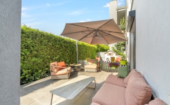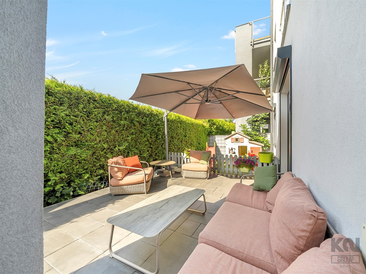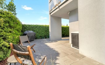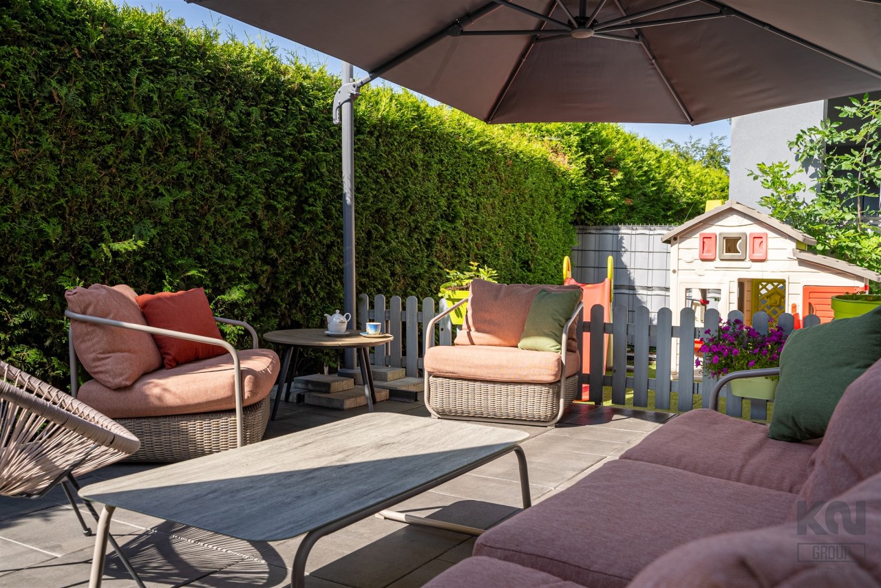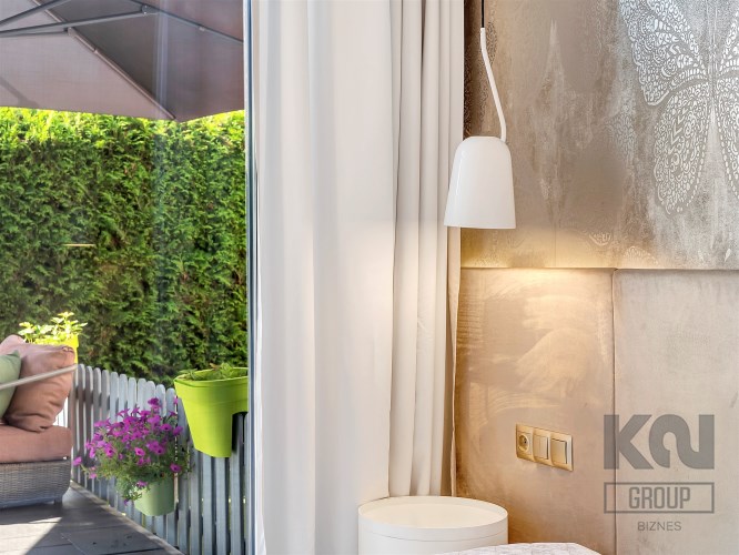 Taras o powierzchni 140 m² otacza mieszkanie z dwóch stron. Częściowo wyłożony płytką Gladio, obsadzony pasem wysokich tui, które zapewniają prywatność i zielone tło do codziennego wypoczynku. To idealna przestrzeń na poranną kawę, rodzinne spotkania czy letnie przyjęcia. Wydzielono tu strefę rekreacyjną z meblami ogrodowymi, miejsce dla dzieci oraz przestrzeń do uprawy roślin.