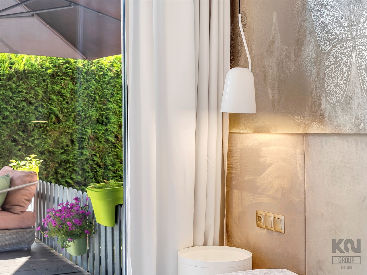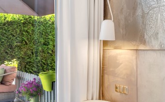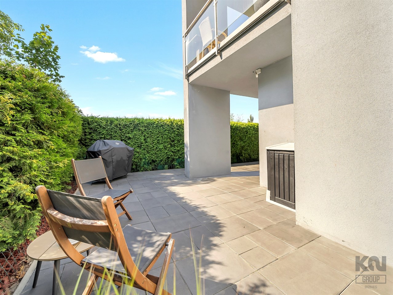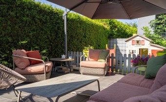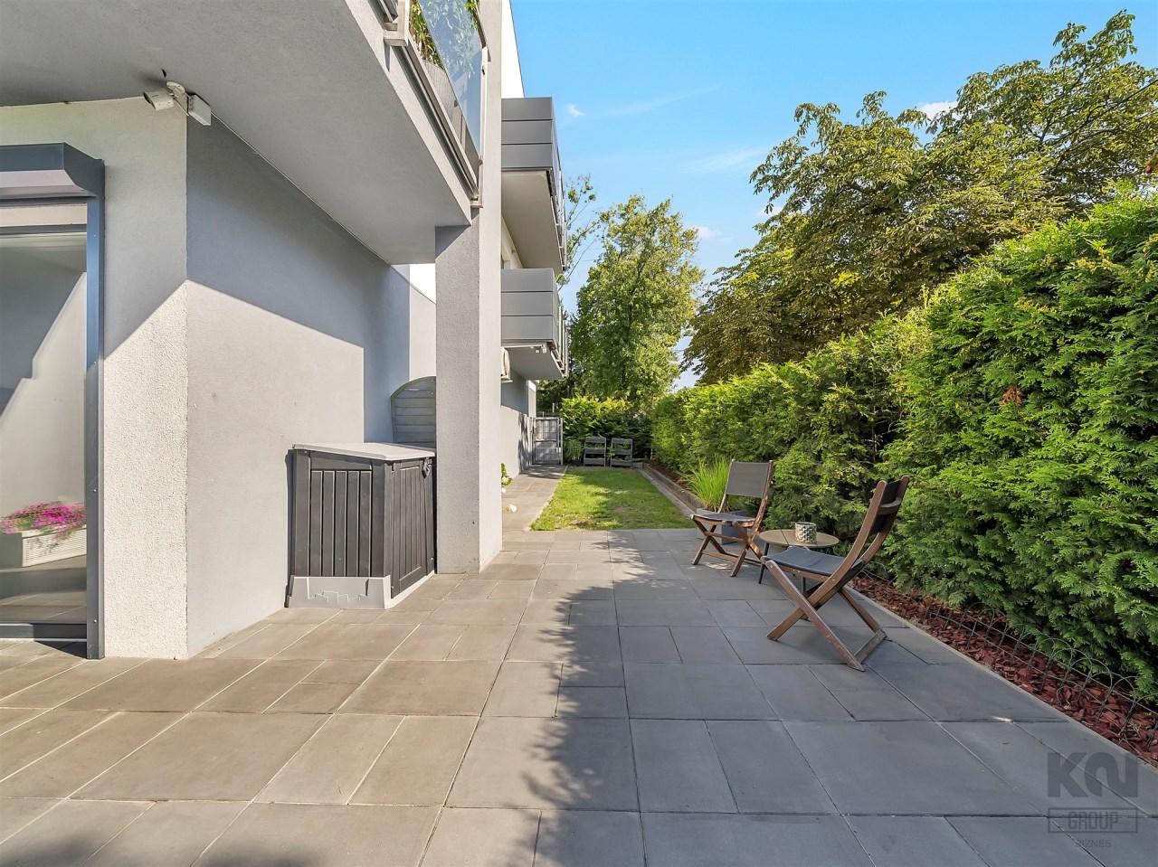 Taras o powierzchni 140 m² otacza mieszkanie z dwóch stron. Częściowo wyłożony płytką Gladio, obsadzony pasem wysokich tui, które zapewniają prywatność i zielone tło do codziennego wypoczynku. To idealna przestrzeń na poranną kawę, rodzinne spotkania czy letnie przyjęcia. Wydzielono tu strefę rekreacyjną z meblami ogrodowymi, miejsce dla dzieci oraz przestrzeń do uprawy roślin.