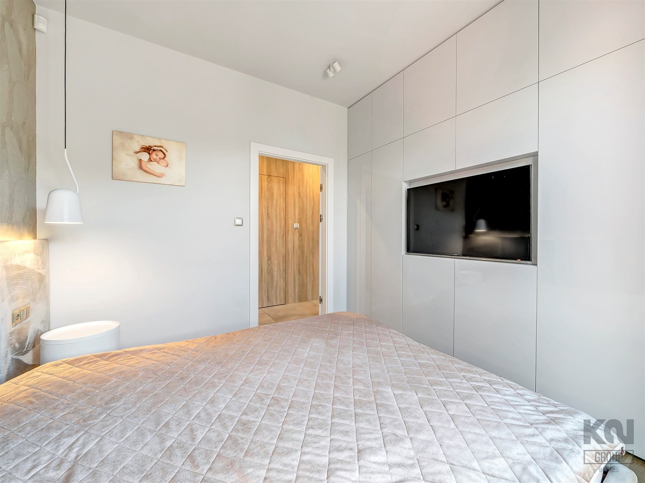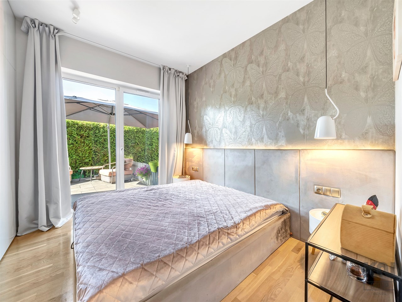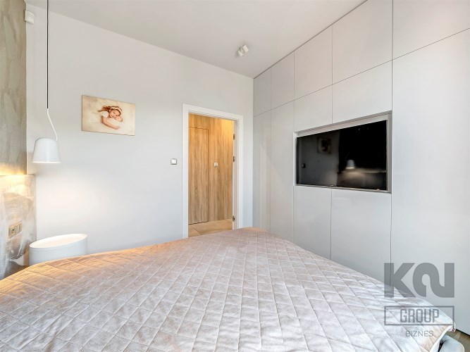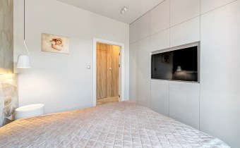 Elegancka i komfortowa, z łóżkiem małżeńskim i tapicerowanym zagłówkiem. Ściana wykończona subtelną tapetą o motywie motyli. Funkcjonalna zabudowa na wymiar w wysokim połysku obejmuje pojemne szafy oraz telewizor 55 cali wkomponowany w ścianę. Drewniana podłoga w ciepłym odcieniu dębu oraz dyskretne oświetlenie LED wprowadzają przytulny klimat.