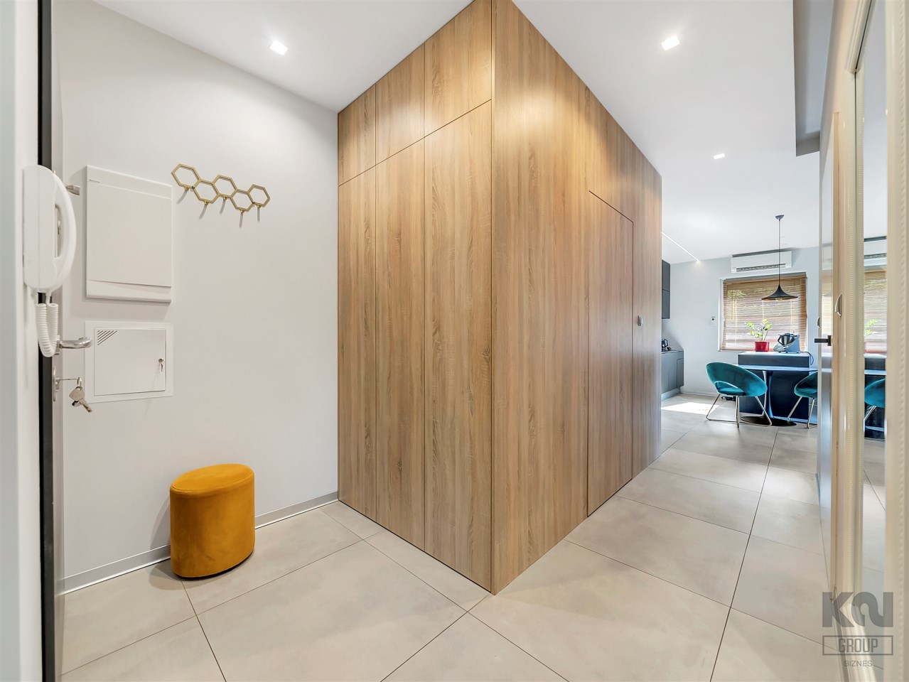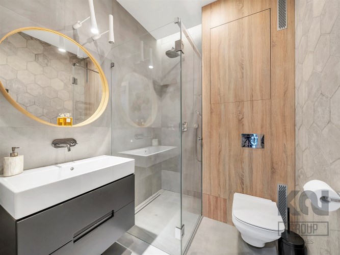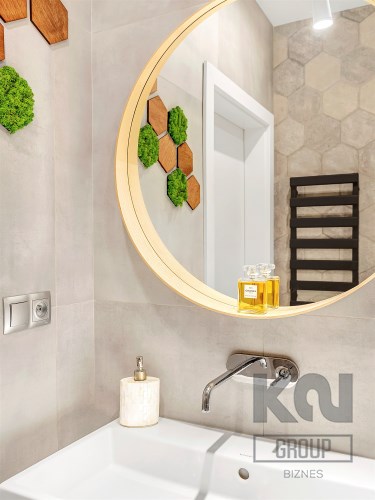 - Łazienka: armatura Hansgrohe, eleganckie płytki heksagonalne, oświetlenie LED;