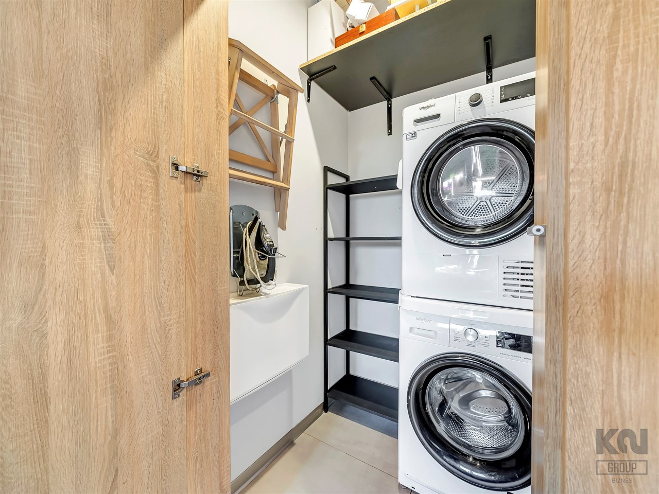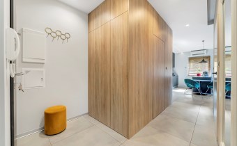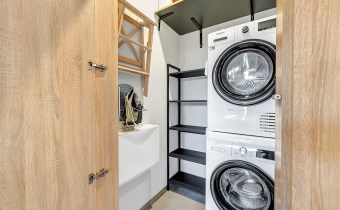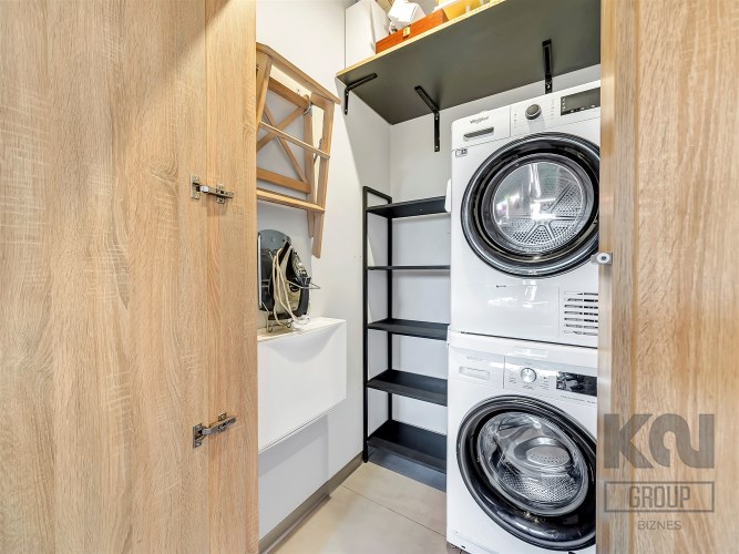 Nowocześnie zaprojektowany, z pojemną zabudową na wymiar mieszczącą garderobę na wszystkie akcesoria codzienne. W jednej części szafy wydzielono pomieszczenie techniczne z pralką, suszarką i półkami. Duże lustro optycznie powiększa przestrzeń, a stonowana kolorystyka nadaje elegancji.