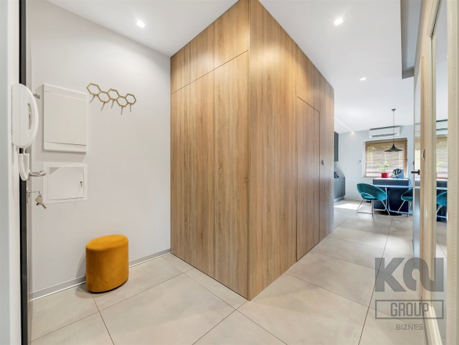 Mieszkanie oferuje przytulne wnętrza w ciepłej i stonowanej kolorystyce, wykończone i wyposażone w wysokim standardzie: