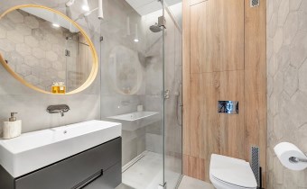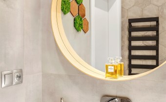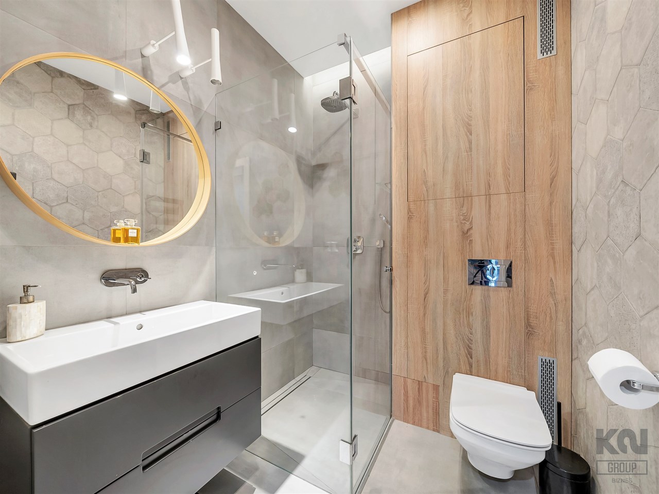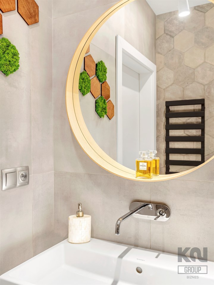 Wyposażenie obejmuje przestronny prysznic typu walk-in z deszczownicą, podwieszaną toaletę oraz prostokątną umywalkę z pojemną szafką. Nad nią duże okrągłe lustro w drewnianej ramie z delikatnym podświetleniem, które współgra z oświetleniem sufitowym i lampami tubowymi.