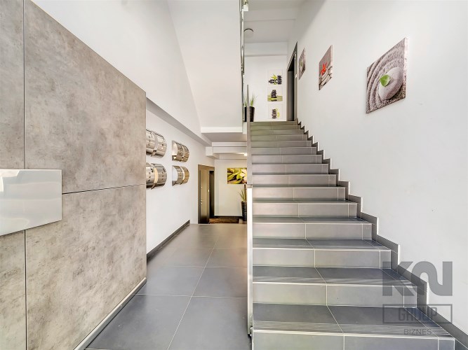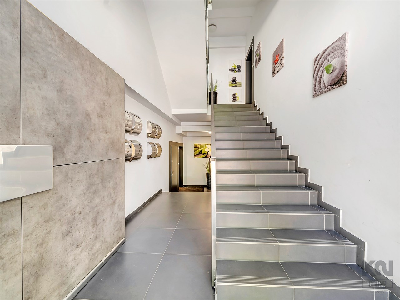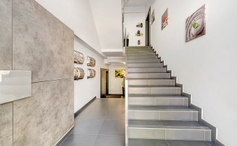 Wejście do wewnątrz budynku prowadzi nowoczesną klatką schodową z eleganckimi płytkami i balustradą