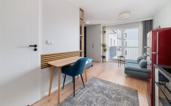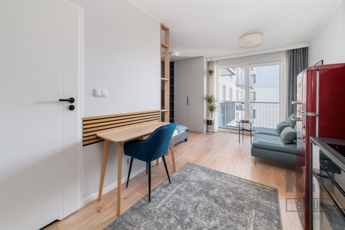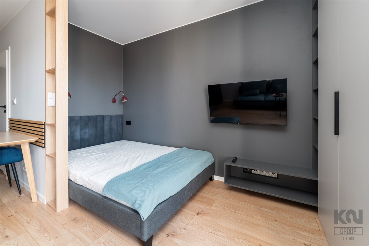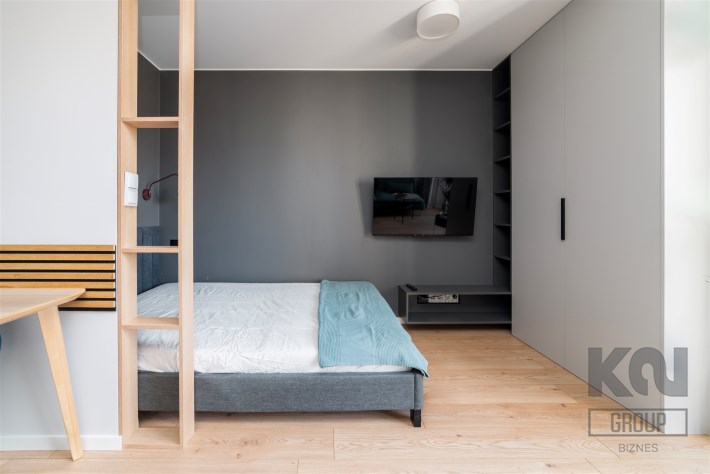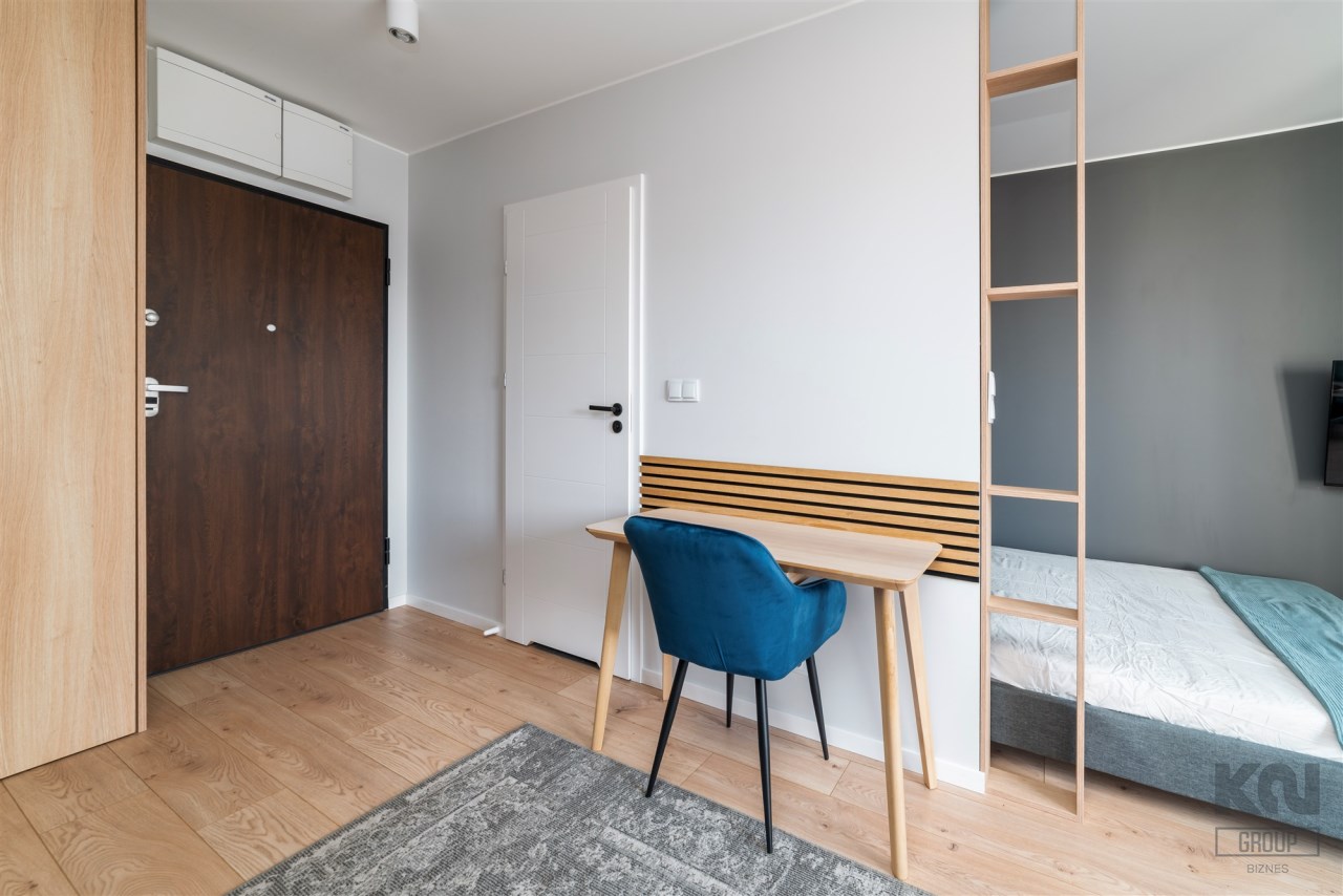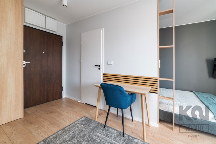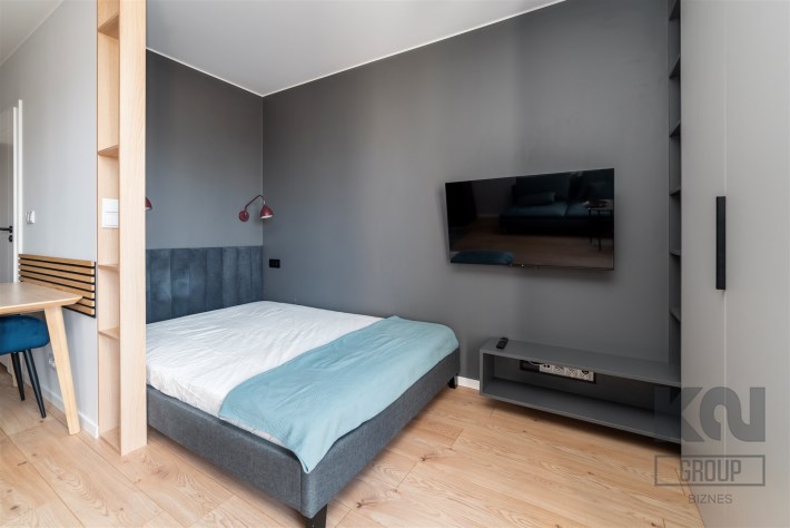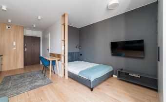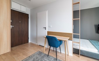 - pokój dzienny z balkonem, wyposażony w wygodną sofę, TV, zabudowaną szafę, łóżko z materacem i biurko z krzesłem;