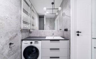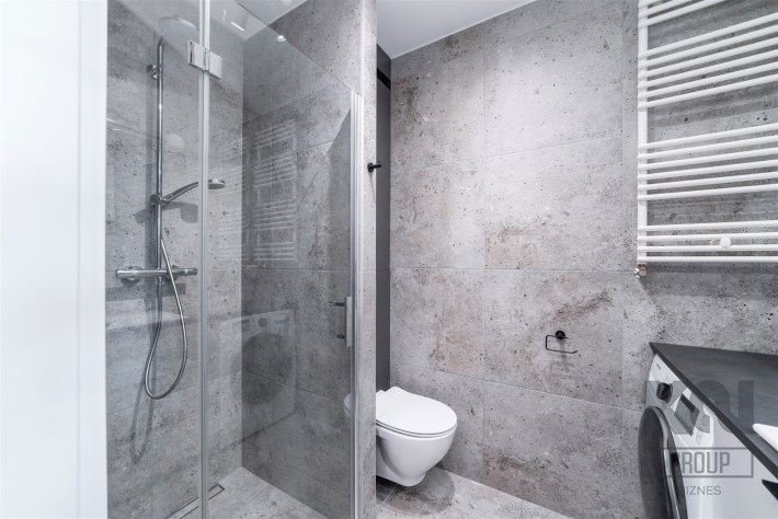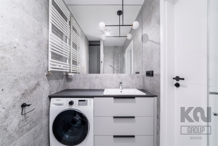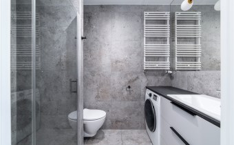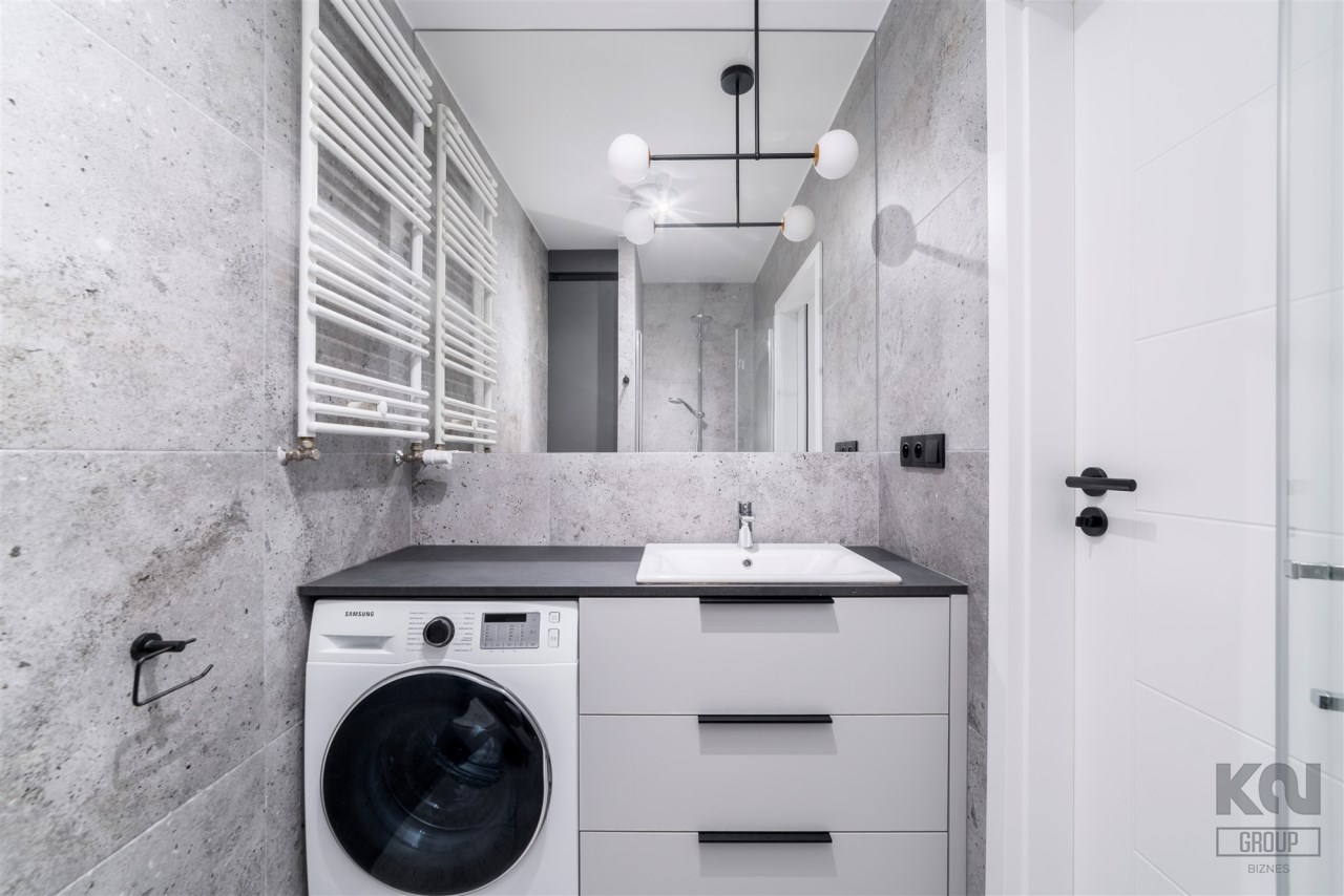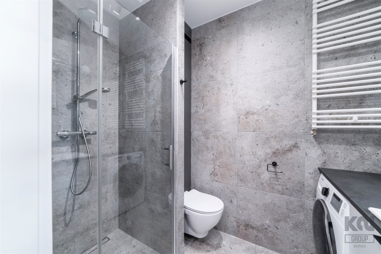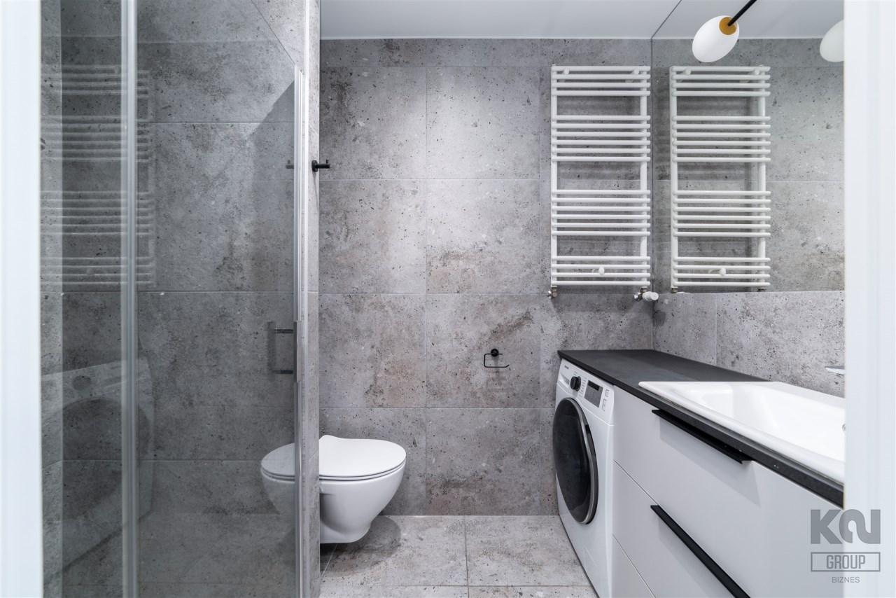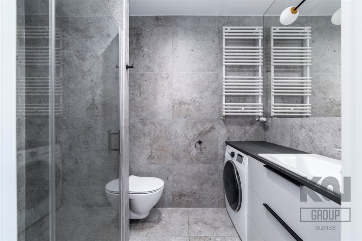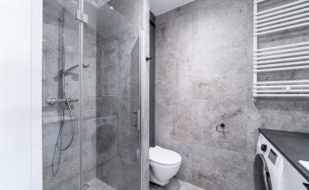 - nowoczesną łazienkę z WC wyposażoną w prysznic oraz pralko-suszarkę;