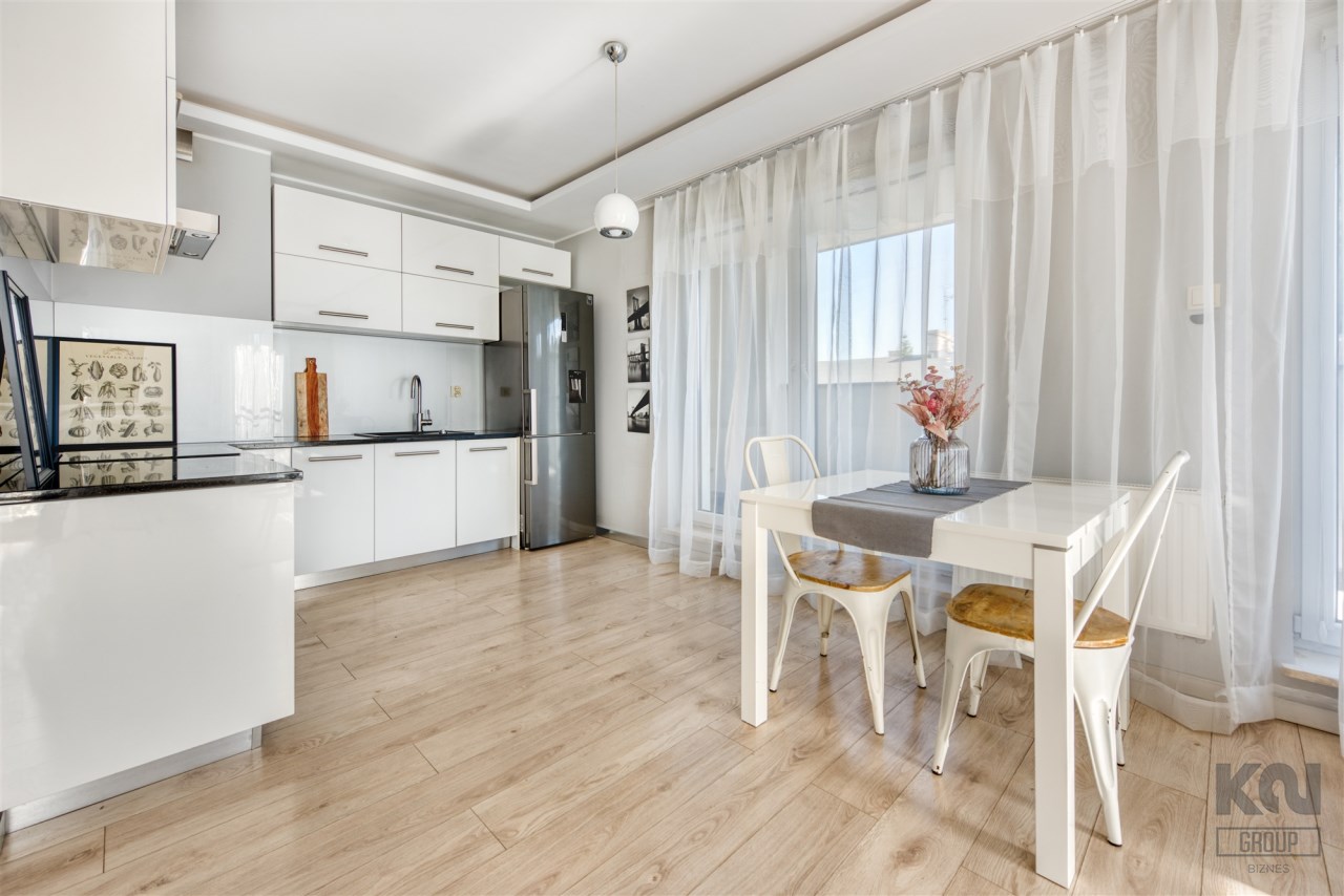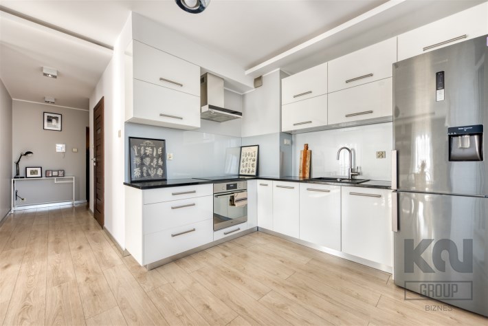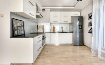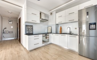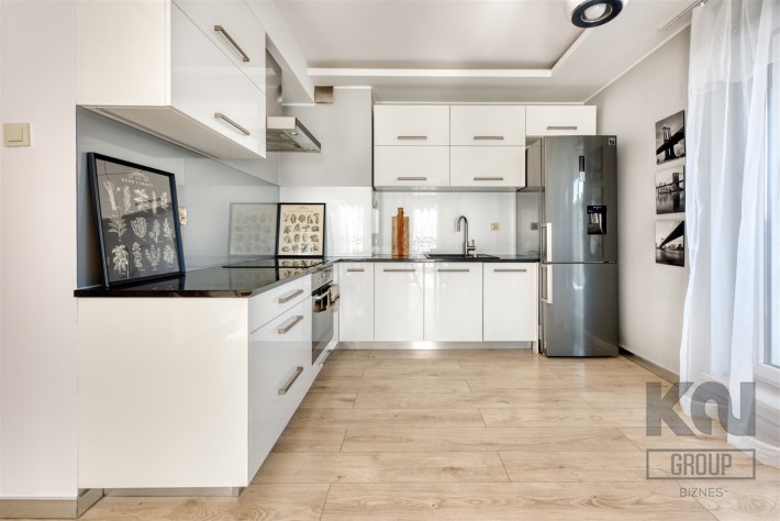 - otwartą kuchnię wyposażoną w płytę induckyjną, okap, piekarnik, lodówkę z zamrażarką, zmywarkę oraz drobne wyposażenie kuchenne;