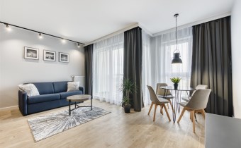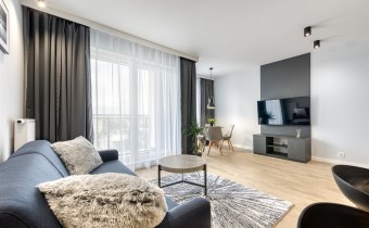 Powierzchnia apartamentu obejmuje: - pokój dzienny z wydzieloną częścią jadalnianą oraz wyjściem na balkon, - funkcjonalny aneks kuchenny wyposażony w płytę indukcyjną, okap, piekarnik, lodówkę z zamrażarką i zmywarkę; - nowoczesną łazienkę wyposażoną w natrysk, pralkę, suszarkę, WC; - przedpokój.