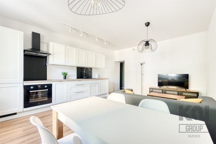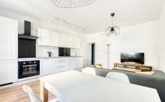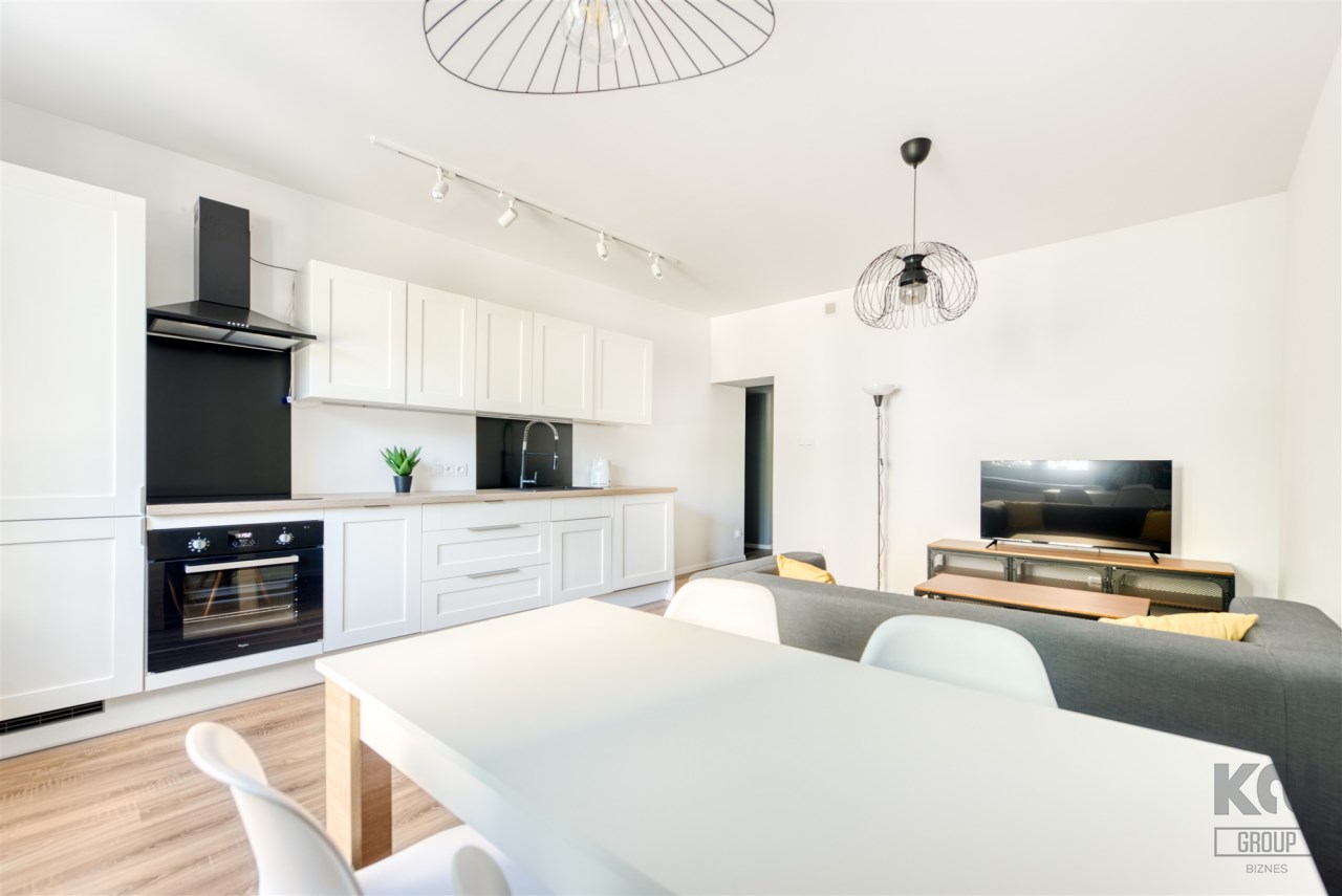 - kompletnie wyposażony aneks kuchenny (płyta indukcyjna, piekarnik, zmywarka, lodówko-zamrażarka, pralka);