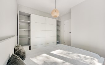 - sypialnię (wyposażoną w łóżko z materacem, dwie szafki nocne oraz bardzo pojemną szafę);