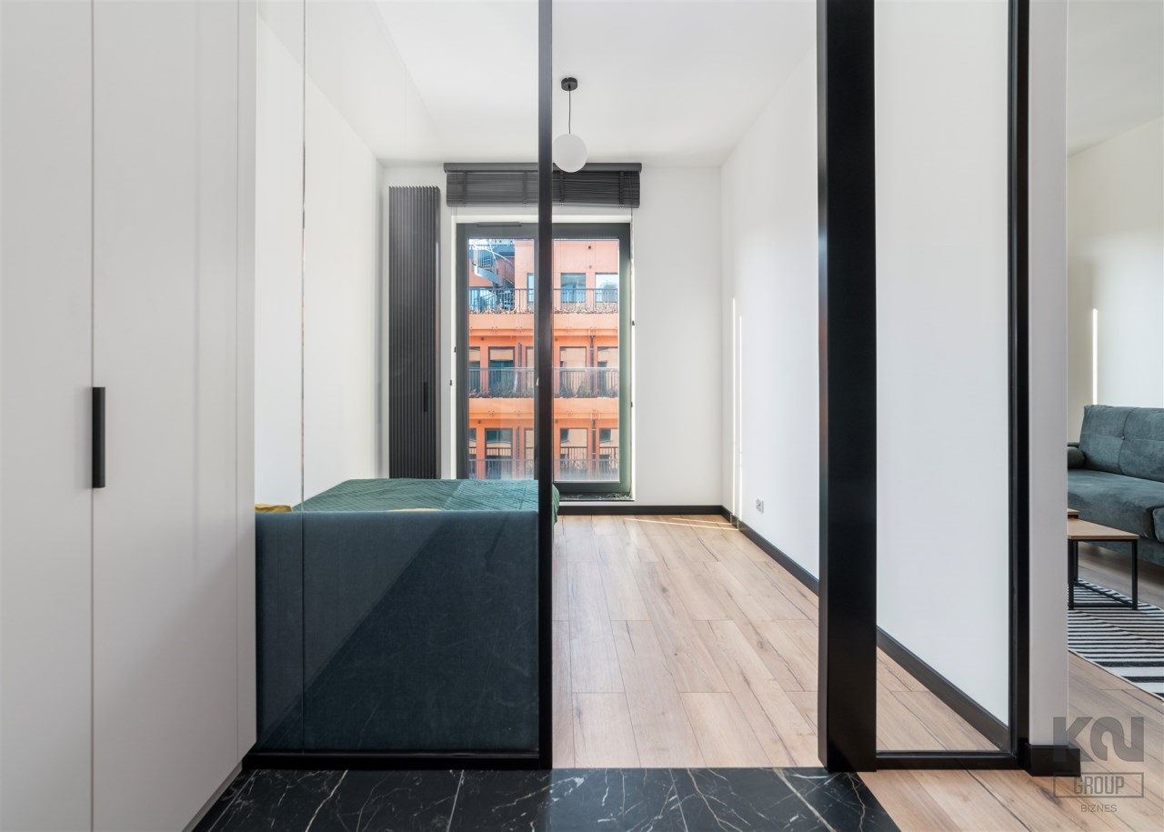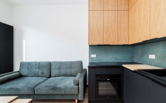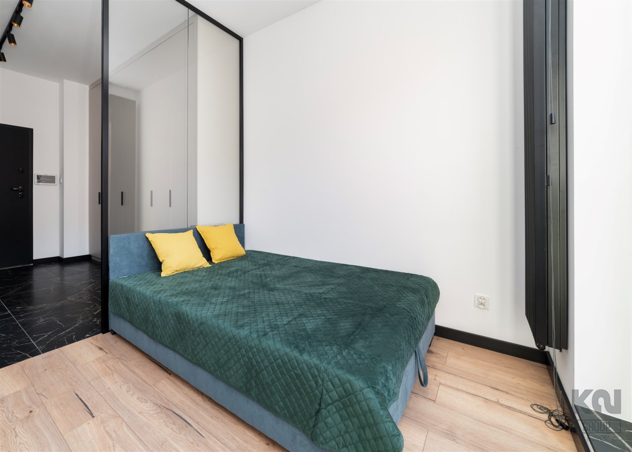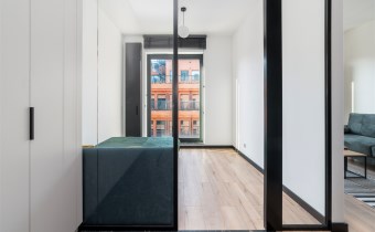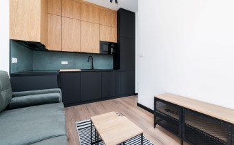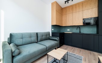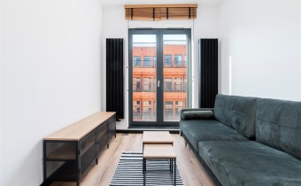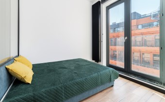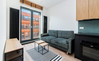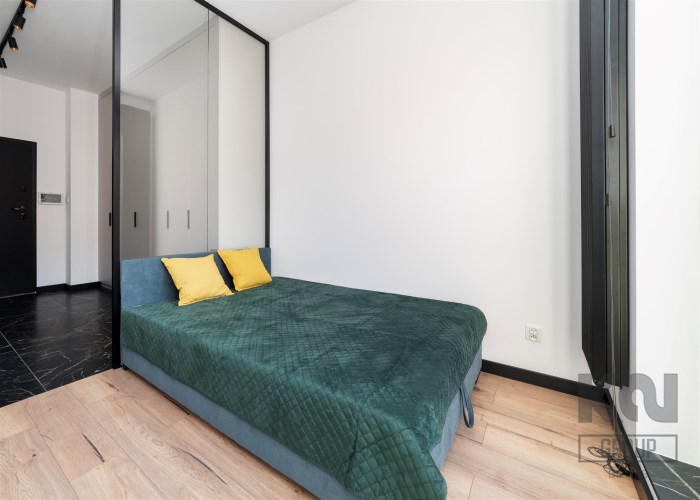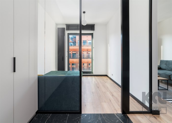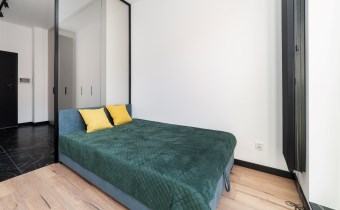 - pokój dzienny (wyposażony w rozkładaną sofę, stolik, komodę) z oknami eksponującymi luksusowe wnętrze osiedla. Duże przeszklenia gwarantują doskonałe doświetlenie wnętrza;