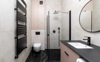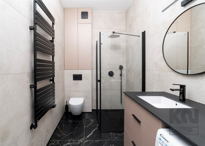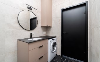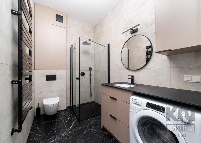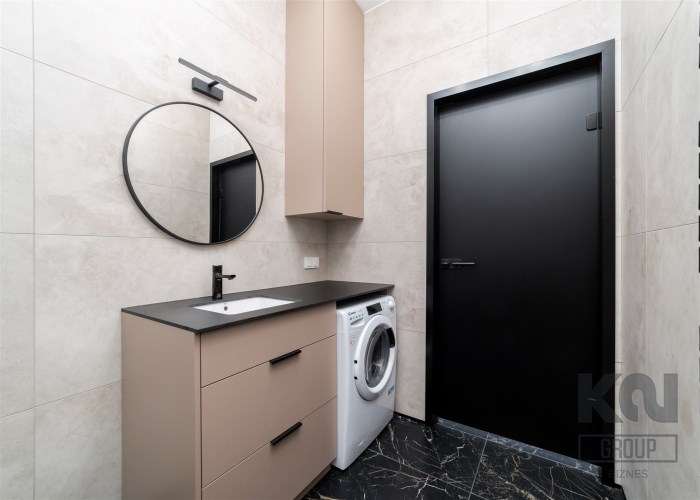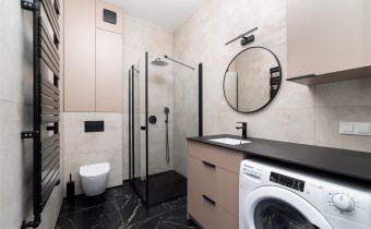 - świetnie zaprojektowaną łazienkę z WC wyposażoną prysznic walk-in, pralko-suszarkę, umywalkę;