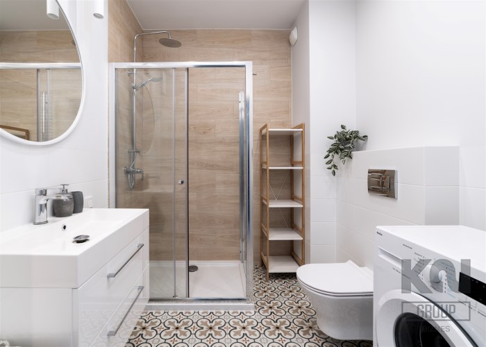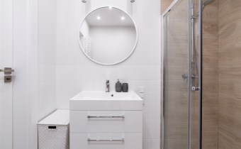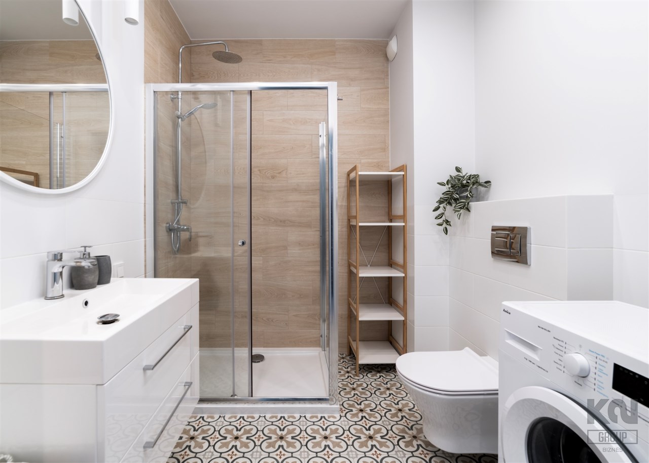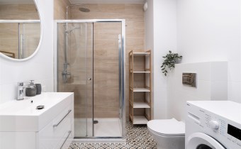 - nowoczesną łazienkę wyposażoną w prysznic oraz pralkę;