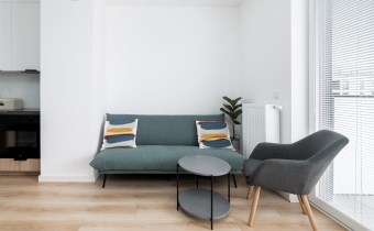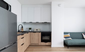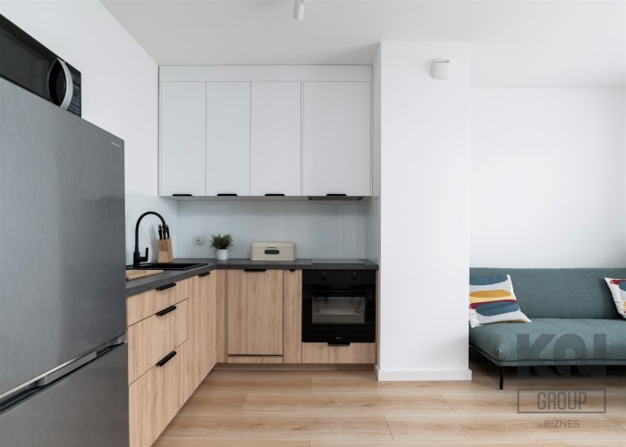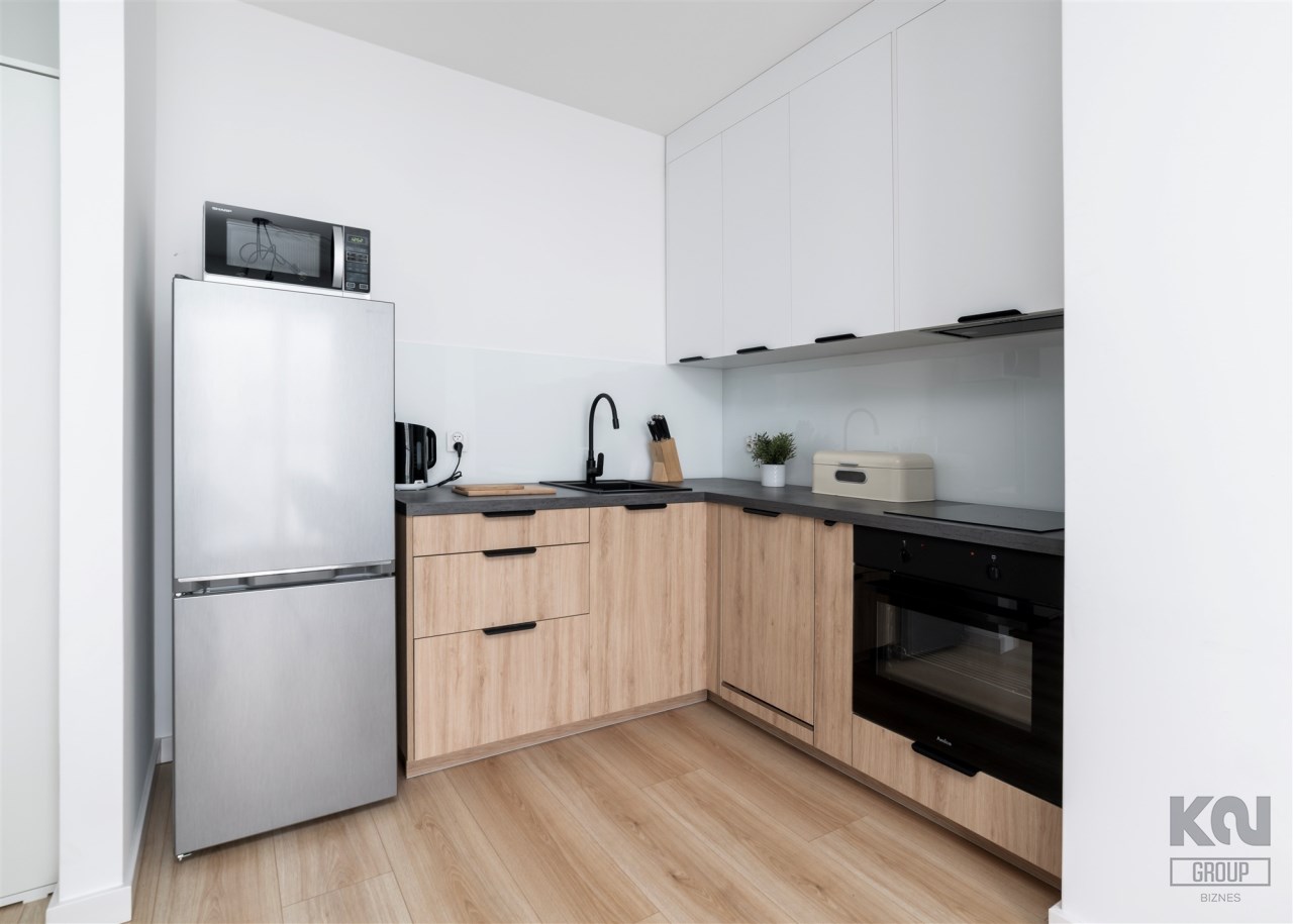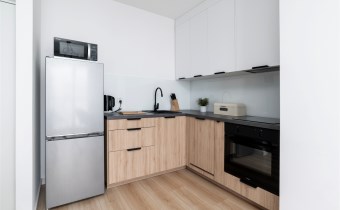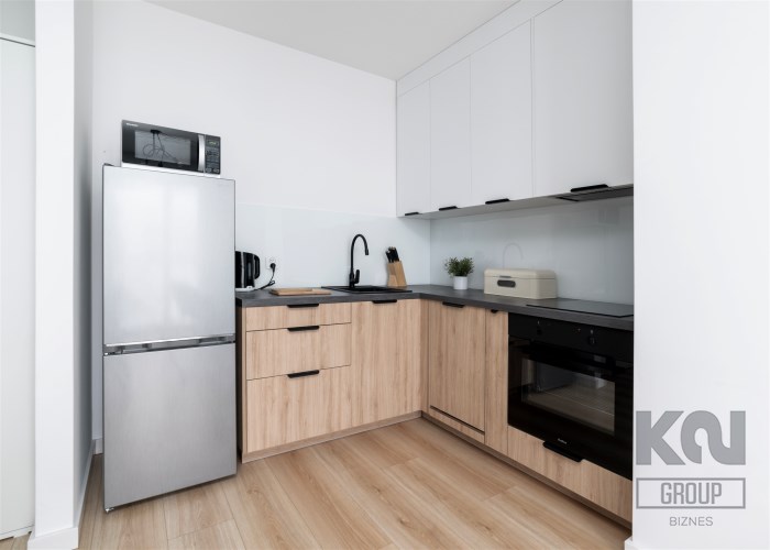 - otwartą, nowoczesną kuchnię wyposażoną w płytę indukcyjną, okap, piekarnik, lodówkę z zamrażarką oraz zmywarkę i mikrofalę;