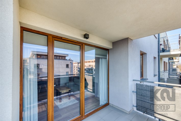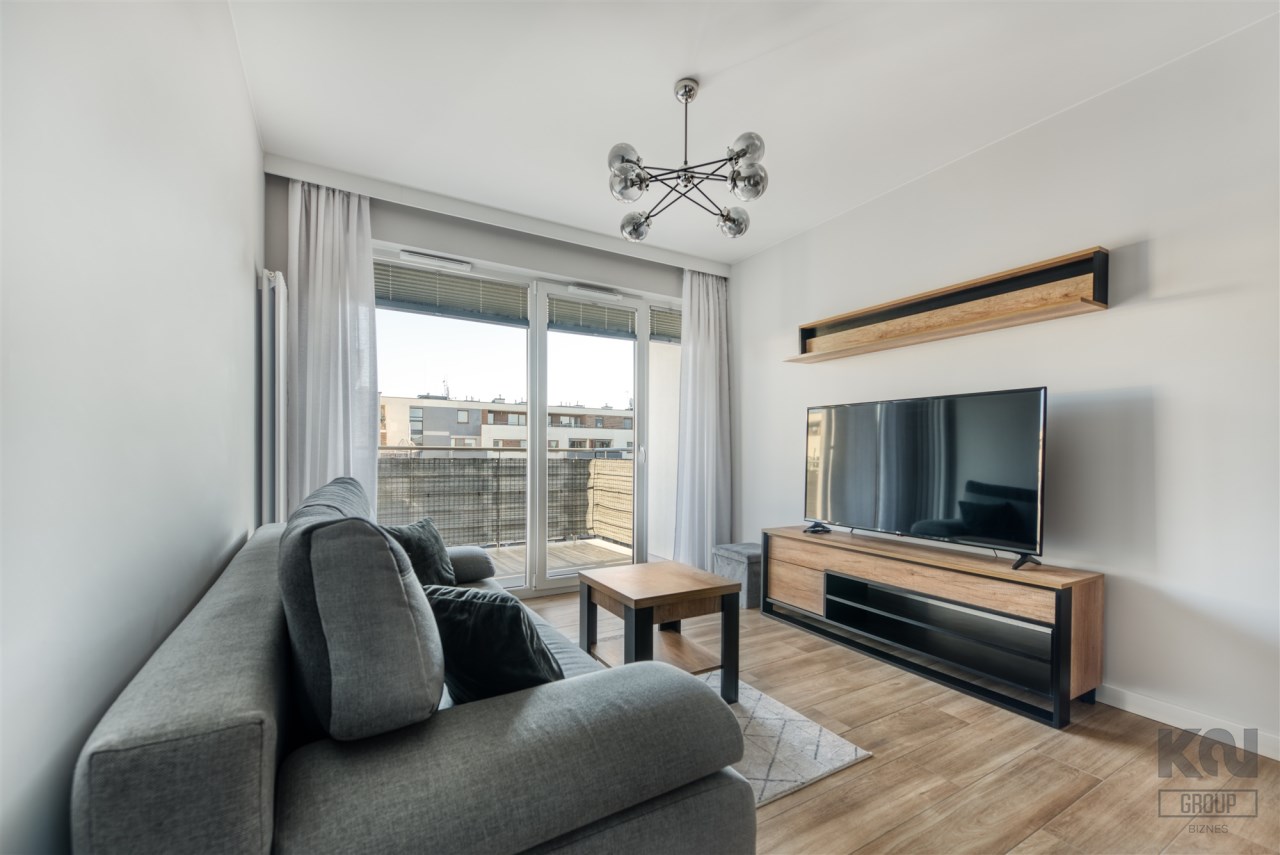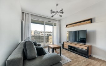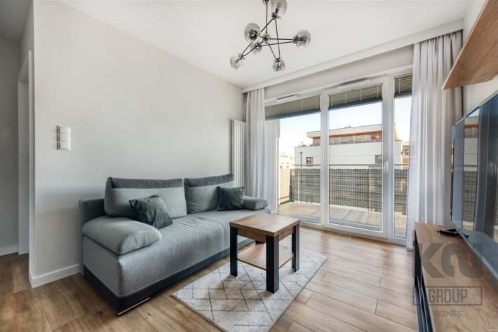 - jasny salon z wyjściem na balkon;